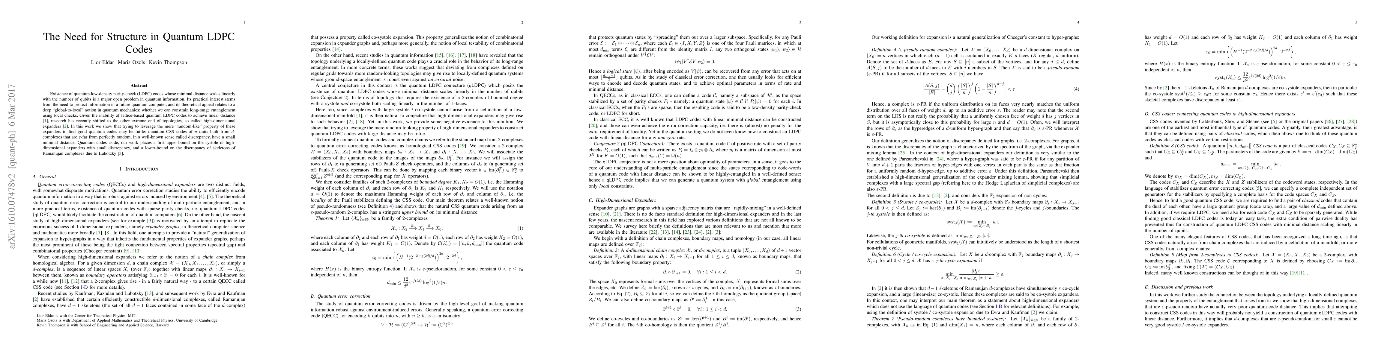 Existence of quantum low-density parity-check (LDPC) codes whose minimal distance scales linearly with the number of qubits is a major open problem in quantum information. Its practical interest stems from the need to protect information in a future quantum computer, and its theoretical appeal relates to a deep "global-to-local" notion in quantum mechanics: whether we can constrain long-range entanglement using local checks. Given the inability of lattice-based quantum LDPC codes to achieve linear distance, research has recently shifted to the other extreme end of topologies, so called high-dimensional expanders. In this work we show that trying to leverage the mere "random-like" property of these expanders to find good quantum codes may be futile: quantum CSS codes of $n$ quits built from $d$-complexes that are $\varepsilon$-far from perfectly random, in a well-known sense called discrepancy, have a small minimal distance. Quantum codes aside, our work places a first upper-bound on the systole of high-dimensional expanders with small discrepancy, and a lower-bound on the discrepancy of skeletons of Ramanujan complexes due to Lubotzky.