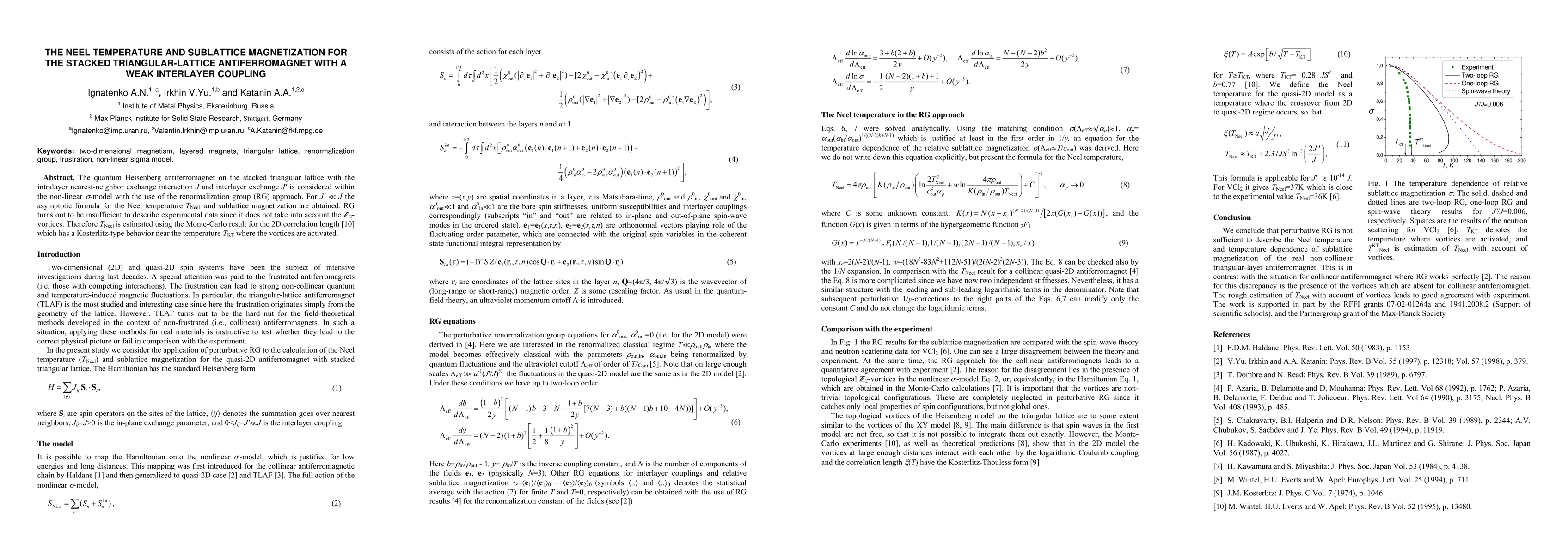 The quantum Heisenberg antiferromagnet on the stacked triangular lattice with the intralayer nearest-neighbor exchange interaction J and interlayer exchange J' is considered within the non-linear $\sigma$-model with the use of the renormalization group (RG) approach. For J' << J the asymptotic formula for the Neel temperature $T_{Neel}$ and sublattice magnetization are obtained. RG turns out to be insufficient to describe experimental data since it does not take into account the $\mathcal{Z}_2$-vortices. Therefore $T_{Neel}$ is estimated using the Monte-Carlo result for the 2D correlation length [10] which has a Kosterlitz-type behavior near the temperature $T_{KT}$ where the vortices are activated.