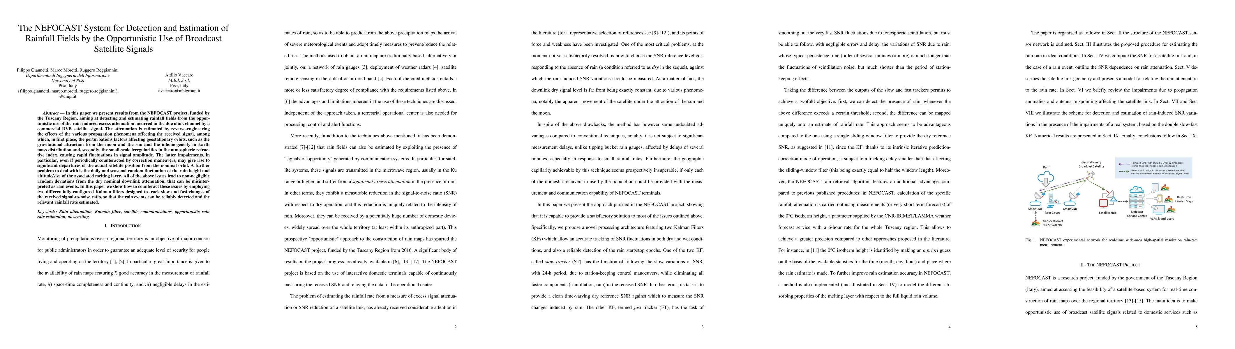 In this paper we present results from the NEFOCAST project, funded by the Tuscany Region, aiming at detecting and estimating rainfall fields from the opportunistic use of the rain-induced excess attenuation incurred in the downlink channel by a commercial DVB satellite signal. The attenuation is estimated by reverse-engineering the effects of the various propagation phenomena affecting the received signal, among which, in first place, the perturbations factors affecting geostationary orbits, such as the gravitational attraction from the moon and the sun and the inhomogeneity in Earth mass distribution and, secondly, the small-scale irregularities in the atmospheric refractive index, causing rapid fluctuations in signal amplitude. The latter impairments, in particular, even if periodically counteracted by correction maneuvers, may give rise to significant departures of the actual satellite position from the nominal orbit. A further problem to deal with is the daily and seasonal random fluctuation of the rain height and altitude/size of the associated melting layer. All of the above issues lead to non-negligible random deviations from the dry nominal downlink attenuation, that can be misinterpreted as rain events. In this paper we show how to counteract these issues by employing two differentially-configured Kalman filters designed to track slow and fast changes of the received signal-to-noise ratio, so that the rain events can be reliably detected and the relevant rainfall rate estimated.