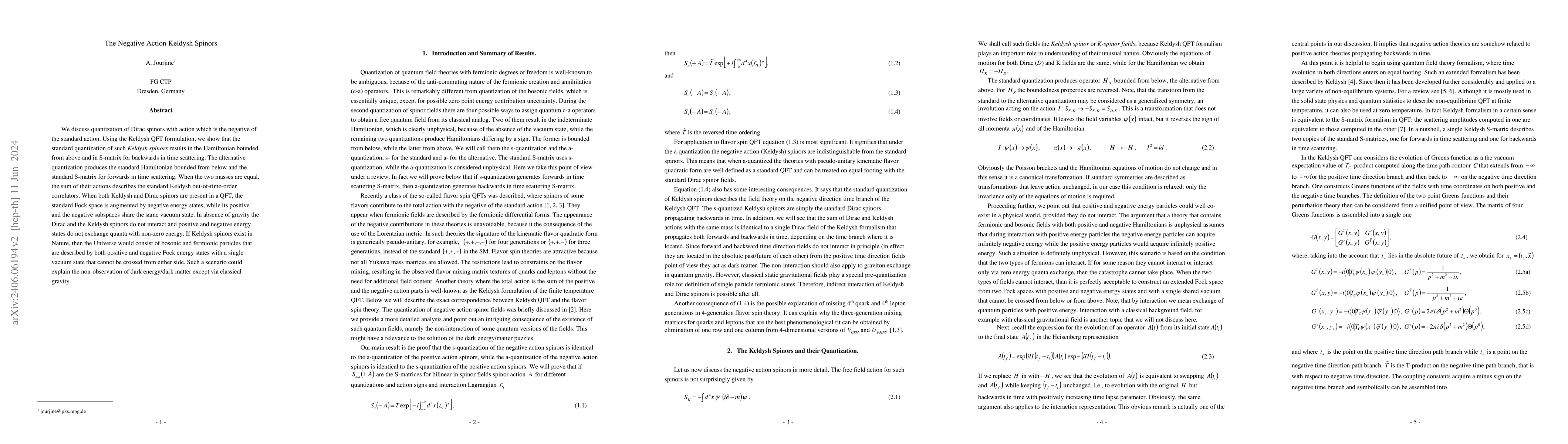 We discuss quantization of Dirac spinors with action which is the negative of the standard action. Using the Keldysh QFT formulation, we show that the standard quantization of such Keldysh spinors results in the Hamiltonian bounded from above and in S-matrix for backwards in time scattering. The alternative quantization produces the standard Hamiltonian bounded from below and the standard S-matrix for forwards in time scattering. When the two masses are equal, the sum of their actions describes the standard Keldysh out-of-time-order correlators. When both Keldysh and Dirac spinors are present in a QFT, the standard Fock space is augmented by negative energy states, while its positive and the negative subspaces share the same vacuum state. In absence of gravity the Dirac and the Keldysh spinors do not interact and positive and negative energy states do not exchange quanta with non-zero energy. If Keldysh spinors exist in Nature, then the Universe would consist of bosonic and fermionic particles that are described by both positive and negative Fock energy states with a single vacuum state that cannot be crossed from either side. Such a scenario could explain the non-observation of dark energy/dark matter except via classical gravity.