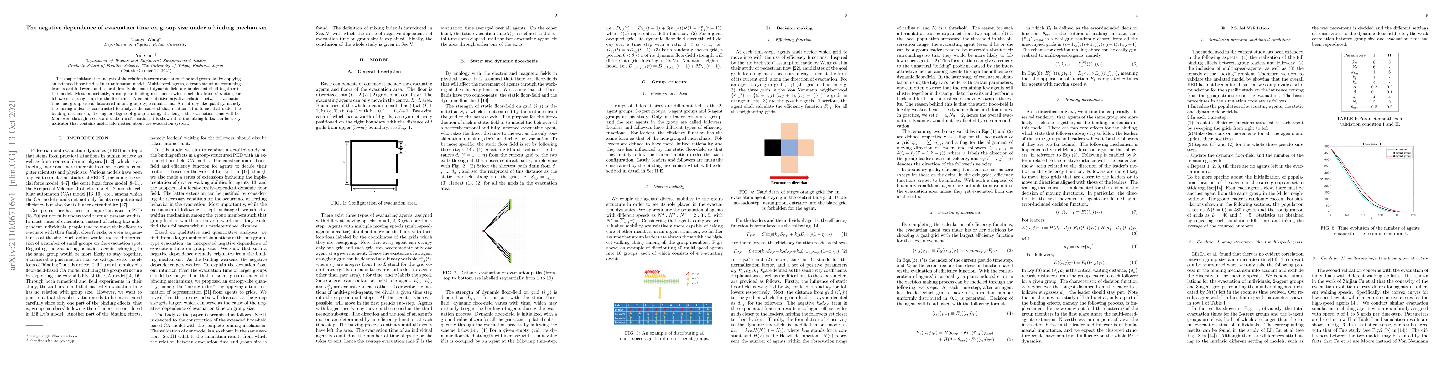 This paper initiates the analysis of the relation between evacuation time and group size by applying an extended floor field cellular automaton model. Agents with various speeds, a group structure containing leaders and followers, and a dynamic field dependent on local population density are implemented all together in the model. Most importantly, a complete binding mechanism which includes leaders waiting for followers is brought up for the first time. A counterintuitive negative relation between evacuation time and group size is discovered in simulations. An entropy like quantity, namely the mixing index, is constructed to analyze the cause of that relation. It is found that under the binding mechanism, the higher degree of group mixing, the longer the evacuation time will be. Moreover, through a constant scale transformation, it is shown that the mixing index can be a key indicator that contains useful information about the evacuation system.