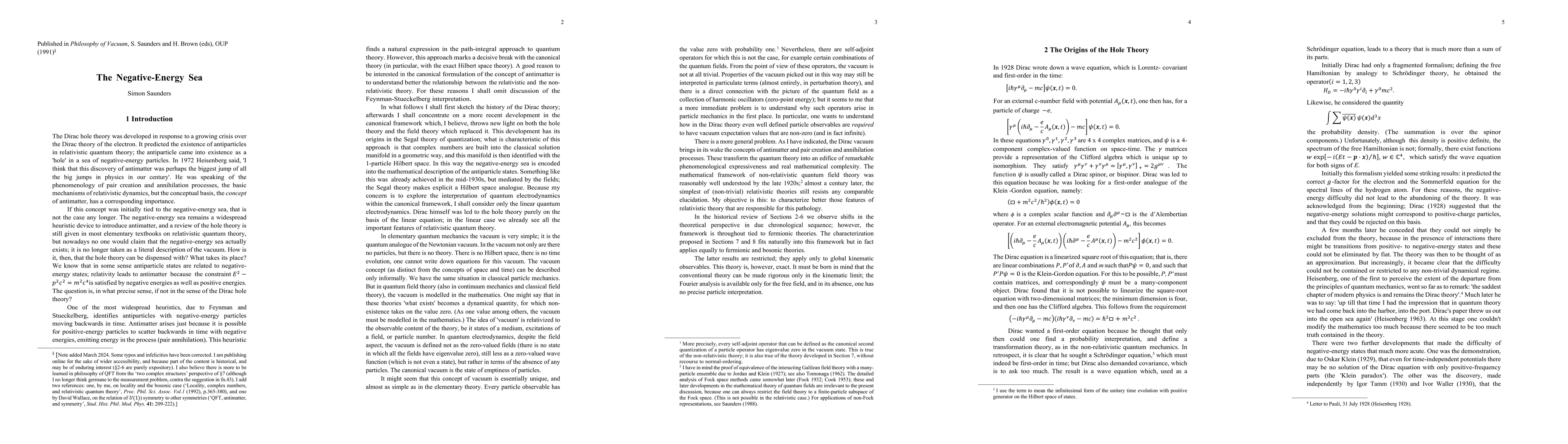 The Dirac negative energy sea introduced the concept of antimatter, and explained it, not least in its relationship to negative-energy solutions to the wave equation. Post-war, it was largely displaced by what I shall call the 'standard formalism', dependent, among other things, on normal-ordering. A much better explanation is provided by the 'two complex structures' viewpoint, as first introduced by Irving Segal: the one ('natural') kind of complex numbers at the level of covariant, local fields; and the other ('particle') complex numbers at the level of the one-particle Hilbert space and Fock space. The former is local, the latter non-local: therein lies the fundamental difference between relativistic and non-relativistic quantum theory.