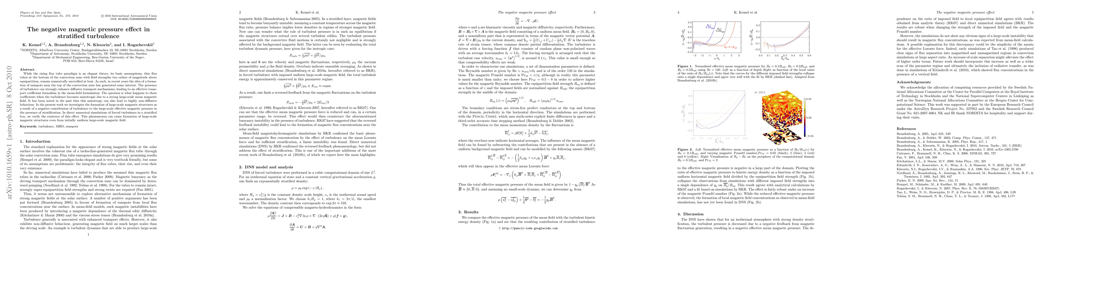 While the rising flux tube paradigm is an elegant theory, its basic assumptions, thin flux tubes at the bottom of the convection zone with field strengths two orders of magnitude above equipartition, remain numerically unverified at best. As such, in recent years the idea of a formation of sunspots near the top of the convection zone has generated some interest. The presence of turbulence can strongly enhance diffusive transport mechanisms, leading to an effective transport coefficient formalism in the mean-field formulation. The question is what happens to these coefficients when the turbulence becomes anisotropic due to a strong large-scale mean magnetic field. It has been noted in the past that this anisotropy can also lead to highly non-diffusive behaviour. In the present work we investigate the formation of large-scale magnetic structures as a result of a negative contribution of turbulence to the large-scale effective magnetic pressure in the presence of stratification. In direct numerical simulations of forced turbulence in a stratified box, we verify the existence of this effect. This phenomenon can cause formation of large-scale magnetic structures even from initially uniform large-scale magnetic field.