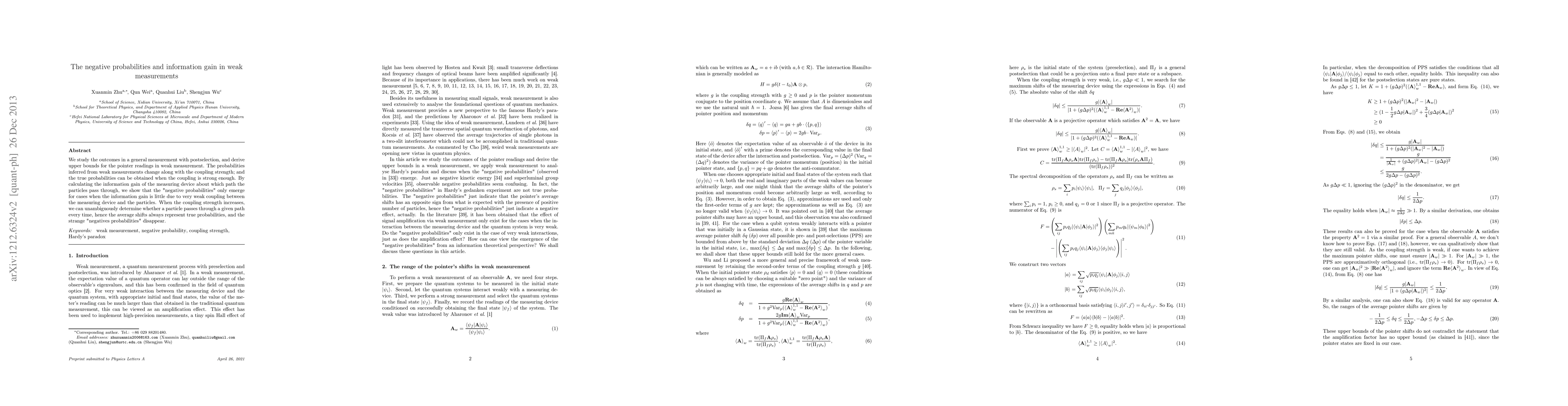 This paper investigates the emergence of "negative probabilities" in weak measurements, demonstrating their appearance correlates with minimal information gain due to weak coupling. As coupling strength increases, the average shifts represent true probabilities, eliminating the phenomenon of negative probabilities.