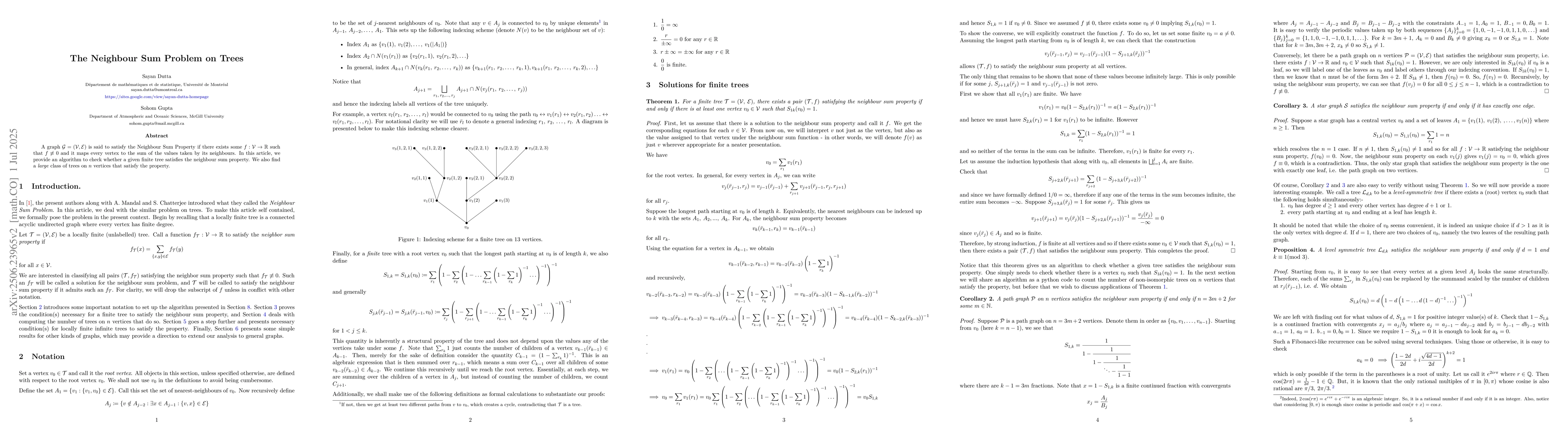 A graph $\mathcal G = (\mathcal V, \mathcal E)$ is said to satisfy the Neighbour Sum Property if there exists some $f:\mathcal V\to\mathbb R$ such that $f\not\equiv 0$ and it maps every vertex to the sum of the values taken by its neighbours. In this article, we provide an algorithm to check whether a given finite tree satisfies the neighbour sum property. We also find a large class of trees on $n$ vertices that satisfy the property.