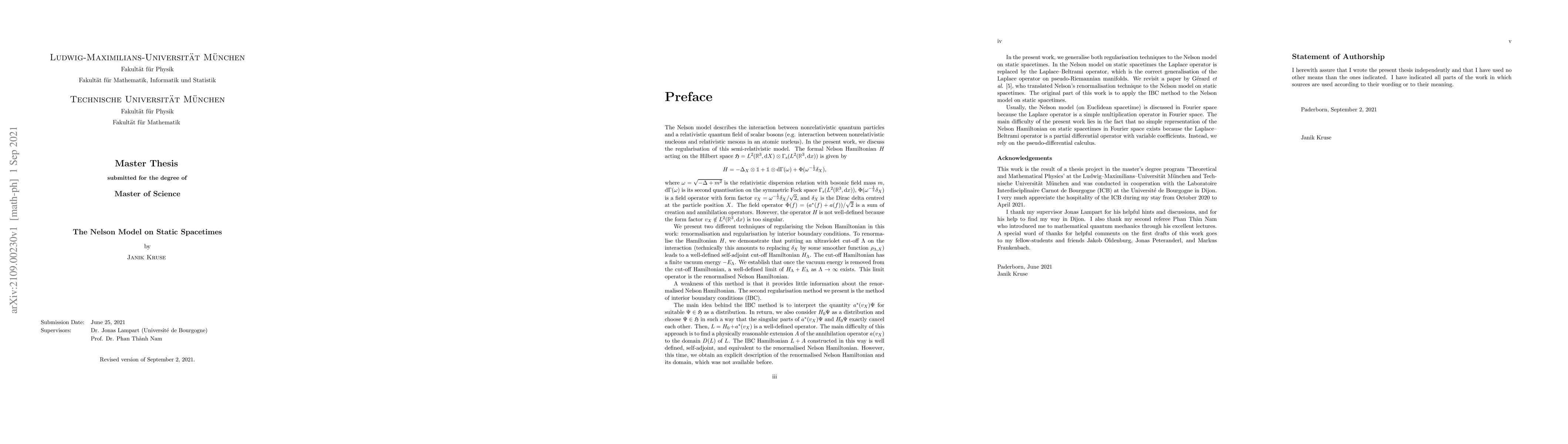 This paper applies novel techniques involving an interior boundary condition to the Nelson model on static spacetimes, providing a rigorous Fock space description of the renormalised Nelson Hamiltonian and its domain. The work builds on Nelson's foundational 1964 demonstration of the model's self-adjoint Hamiltonian.