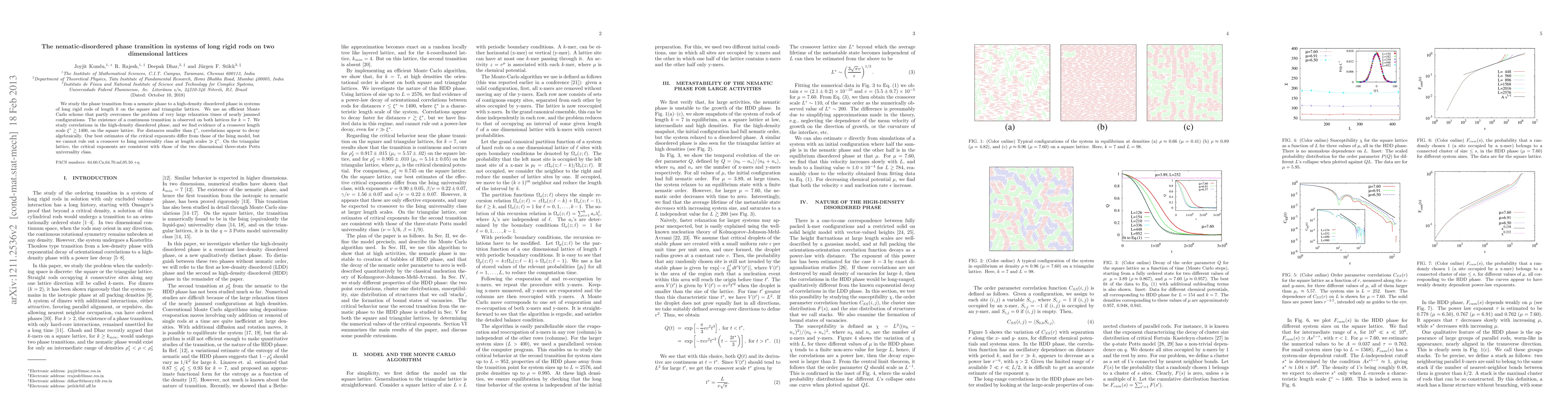 This paper investigates the phase transition in systems of long rigid rods on square and triangular lattices, observing a continuous transition from a nematic to a disordered phase for rod length $k=7$. The study finds a crossover length scale $\xi^* \gtrsim 1400$ on the square lattice, with critical exponents differing from the Ising model but potentially showing Ising universality at larger scales.