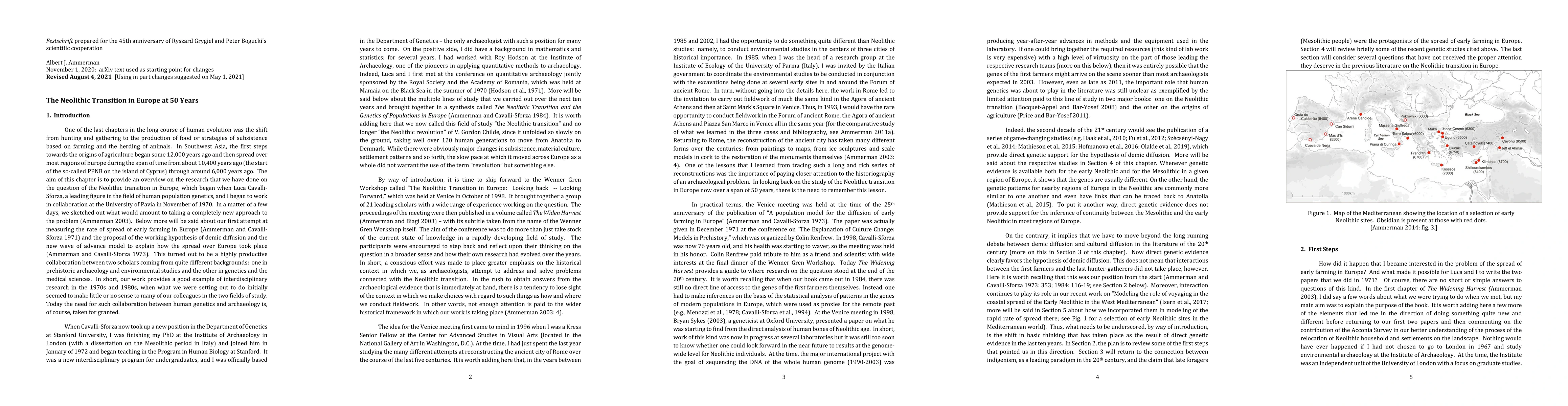 One of the last chapters in the long course of human evolution was the shift from hunting and gathering to the production of food or strategies of subsistence based on farming and the herding of animals. In Southwest Asia, the first steps towards the origins of agriculture began some 12,000 years ago and then spread over most regions of Europe during the span of time from about 10,400 years ago (the start of the so-called PPNB on the island of Cyprus) through around 6,000 years ago. The aim of this chapter is to provide an overview on the research that we have done on the question of the Neolithic transition in Europe, which began when Luca CavalliSforza, a leading figure in the field of human population genetics, and I began to work in collaboration at the University of Pavia in November of 1970. This draft forms the basis of my paper as part of the Festschrift prepared for the 45th anniversary of Ryszard Grygiel and Peter Bogucki's scientific cooperation.