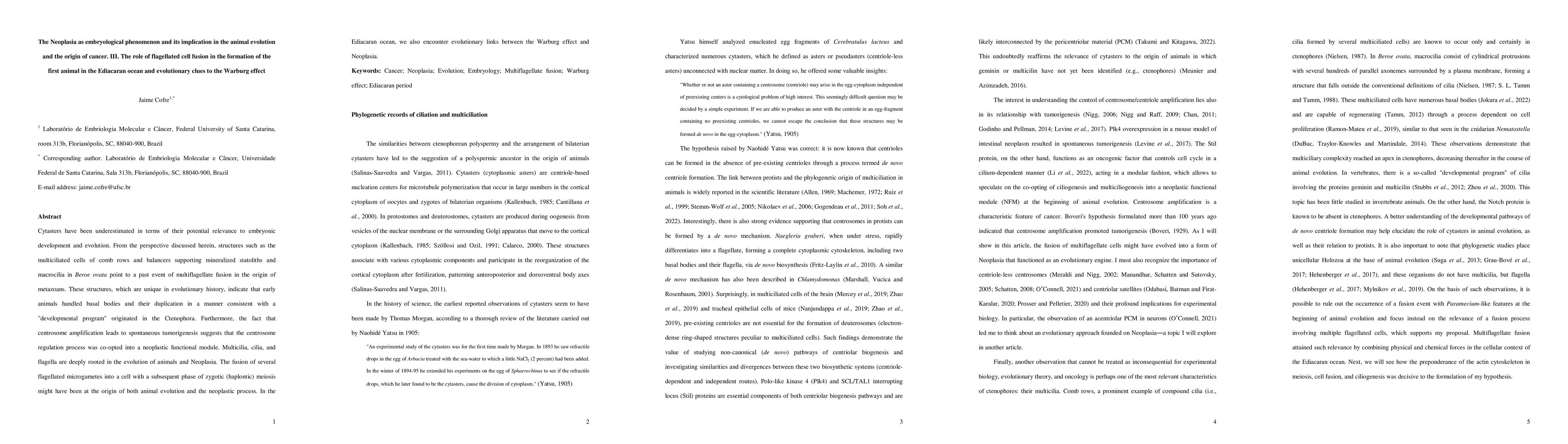 Cytasters have been underestimated in terms of their potential relevance to embryonic development and evolution. From the perspective discussed herein, structures such as the multiciliated cells of comb rows and balancers supporting mineralized statoliths and macrocilia in Beroe ovata point to a past event of multiflagellate fusion in the origin of metazoans. These structures, which are unique in evolutionary history, indicate that early animals handled basal bodies and their duplication in a manner consistent with a "developmental program" originated in the Ctenophora. Furthermore, the fact that centrosome amplification leads to spontaneous tumorigenesis suggests that the centrosome regulation process was co-opted into a neoplastic functional module. Multicilia, cilia, and flagella are deeply rooted in the evolution of animals and Neoplasia. The fusion of several flagellated microgametes into a cell with a subsequent phase of zygotic (haplontic) meiosis might have been at the origin of both animal evolution and the neoplastic process. In the Ediacaran ocean, we also encounter evolutionary links between the Warburg effect and Neoplasia.