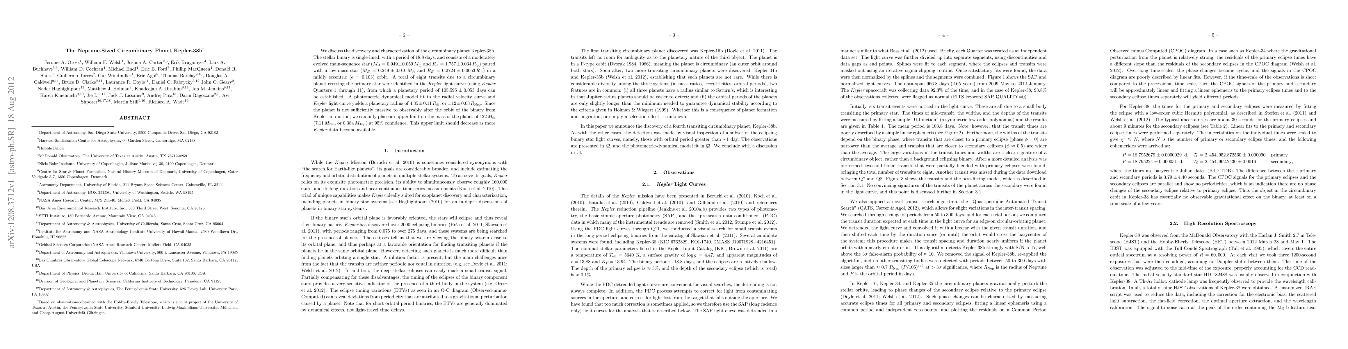 The research paper reports the discovery of Kepler-38b, a Neptune-sized circumbinary planet orbiting a binary star system with an 18.8-day orbital period. The planet has a radius of 1.12 Neptune radii and an orbital period of 105.595 days, with an upper mass limit of 7.11 Neptune masses based on current data.