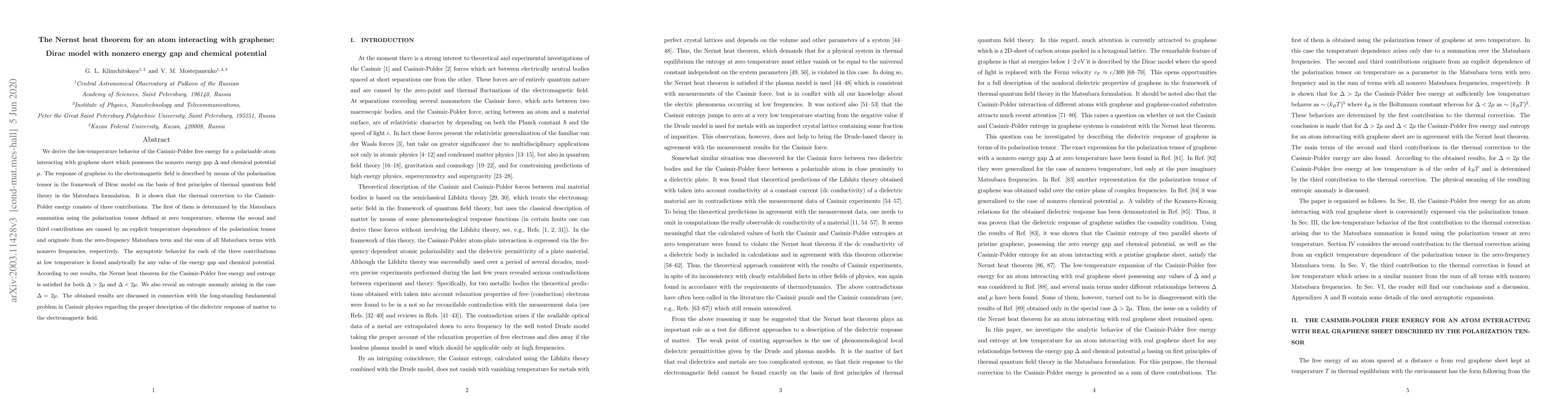 This paper explores the low-temperature behavior of the Casimir-Polder free energy for an atom interacting with graphene, considering the effects of a nonzero energy gap and chemical potential. It reveals three thermal correction contributions to the Casimir-Polder energy, confirming the Nernst heat theorem for various conditions and identifying an entropic anomaly when the energy gap equals twice the chemical potential.