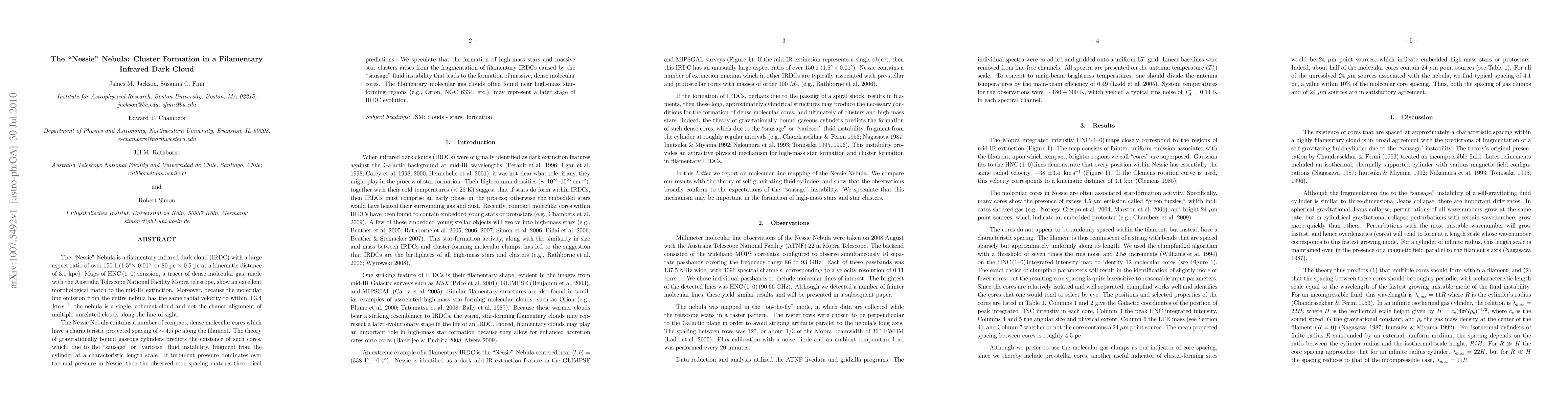 The "Nessie" Nebula, a filamentary infrared dark cloud, exhibits a coherent molecular structure and contains dense cores that align with theoretical predictions of gravitationally bound gaseous cylinders. The formation of high-mass stars and clusters may result from the fragmentation of such filamentary clouds due to the "sausage" fluid instability.