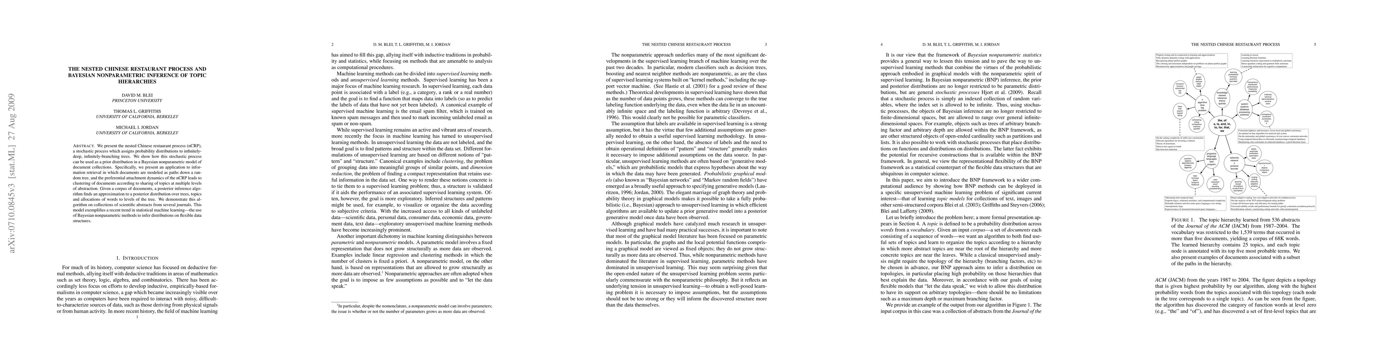 We present the nested Chinese restaurant process (nCRP), a stochastic process which assigns probability distributions to infinitely-deep, infinitely-branching trees. We show how this stochastic process can be used as a prior distribution in a Bayesian nonparametric model of document collections. Specifically, we present an application to information retrieval in which documents are modeled as paths down a random tree, and the preferential attachment dynamics of the nCRP leads to clustering of documents according to sharing of topics at multiple levels of abstraction. Given a corpus of documents, a posterior inference algorithm finds an approximation to a posterior distribution over trees, topics and allocations of words to levels of the tree. We demonstrate this algorithm on collections of scientific abstracts from several journals. This model exemplifies a recent trend in statistical machine learning--the use of Bayesian nonparametric methods to infer distributions on flexible data structures.