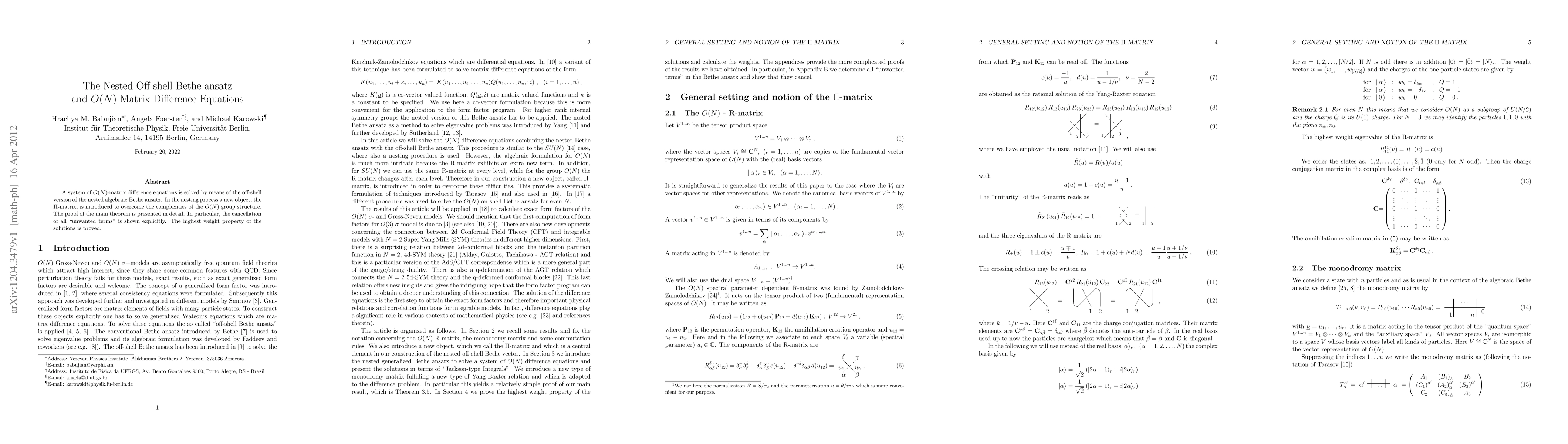 This paper solves a system of O(N)-matrix difference equations using the off-shell nested algebraic Bethe ansatz, introducing the $\Pi$-matrix to manage the complexities of the O(N) group structure. The detailed proof demonstrates the cancellation of unwanted terms and establishes the highest weight property of the solutions.