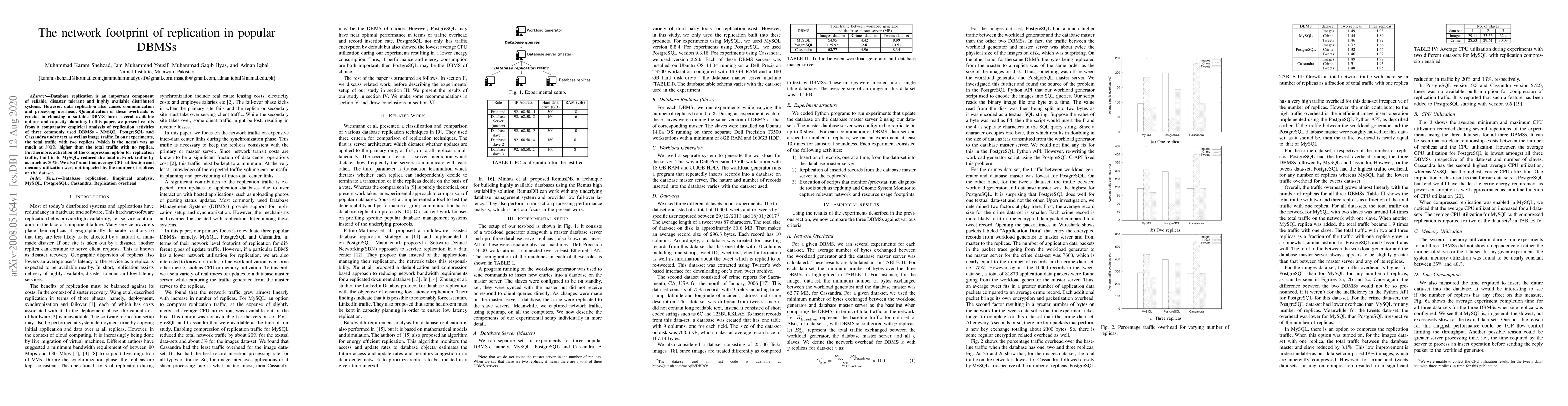 Database replication is an important component of reliable, disaster tolerant and highly available distributed systems. However, data replication also causes communication and processing overhead. Quantification of these overheads is crucial in choosing a suitable DBMS form several available options and capacity planning. In this paper, we present results from a comparative empirical analysis of replication activities of three commonly used DBMSs - MySQL, PostgreSQL and Cassandra under text as well as image traffic. In our experiments, the total traffic with two replicas (which is the norm) was as much as $300$\% higher than the total traffic with no replica. Furthermore, activation of the compression option for replication traffic, built into MySQL, reduced the total network traffic by as much as $20$\%. We also found that average CPU utilization and memory utilization were not impacted by the number of replicas or the dataset.