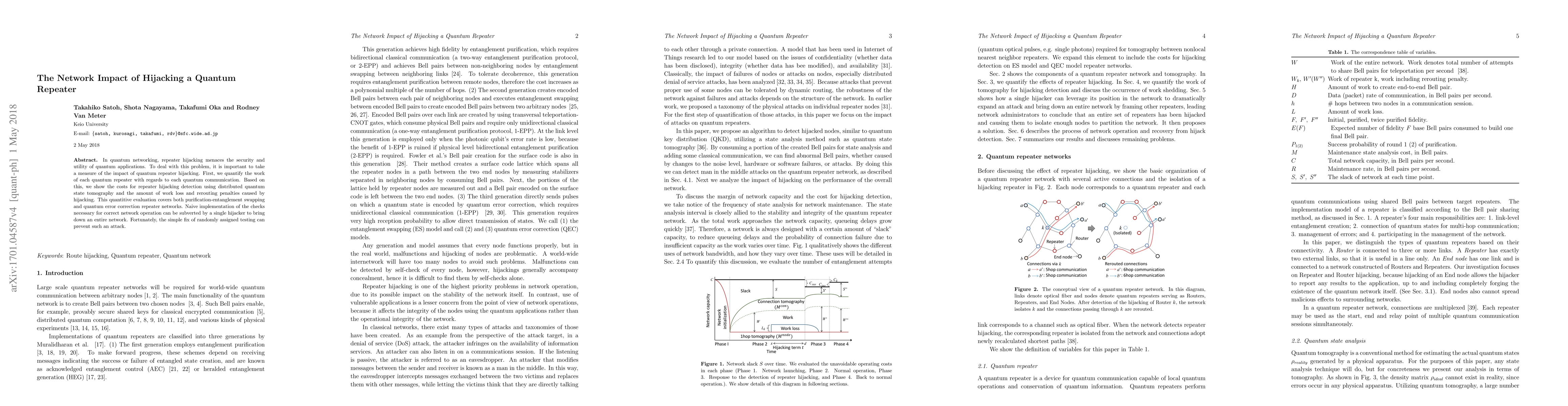 This paper quantifies the impact of quantum repeater hijacking on quantum networks, evaluating the workload and costs of detection, and the penalties from work loss and rerouting. It demonstrates that a single hijacker can compromise the entire network, but random testing can effectively prevent such attacks.