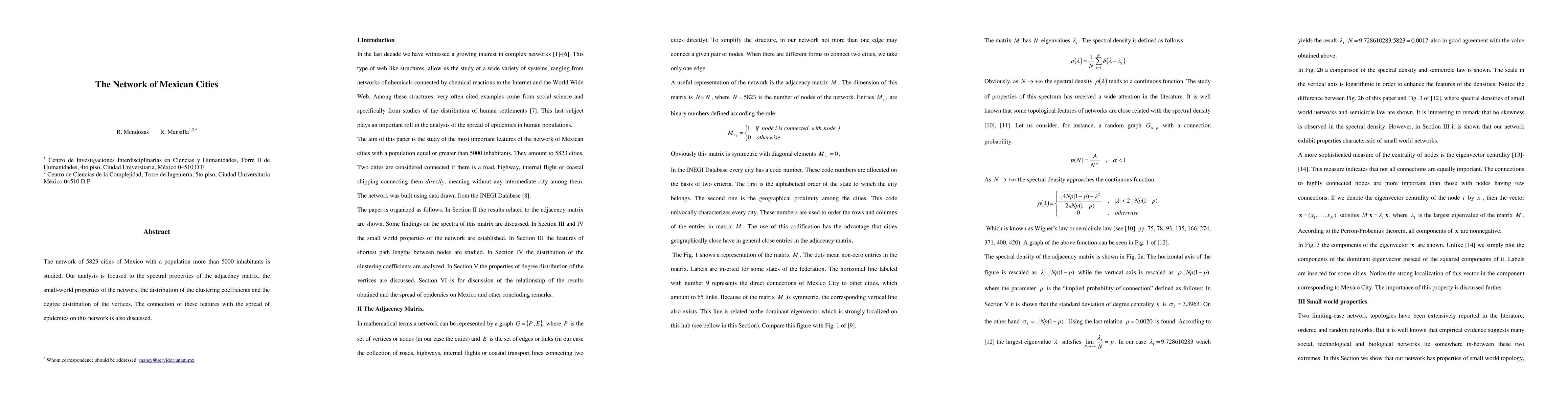 Researchers analyzed Mexico's network of 5823 cities with over 5000 inhabitants, focusing on its spectral properties, small-world characteristics, and epidemic spread features.