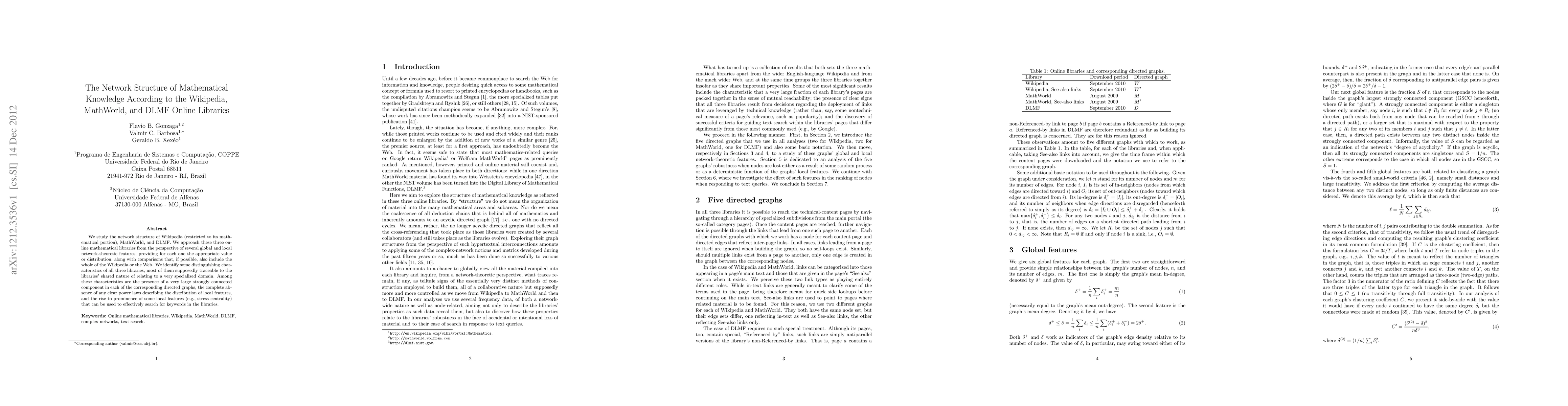 This research examines the network structure of mathematical content in Wikipedia, MathWorld, and DLMF, analyzing global and local network features. It highlights the presence of a large strongly connected component in the directed graphs and notes the absence of power laws, emphasizing the importance of local features for keyword searches.