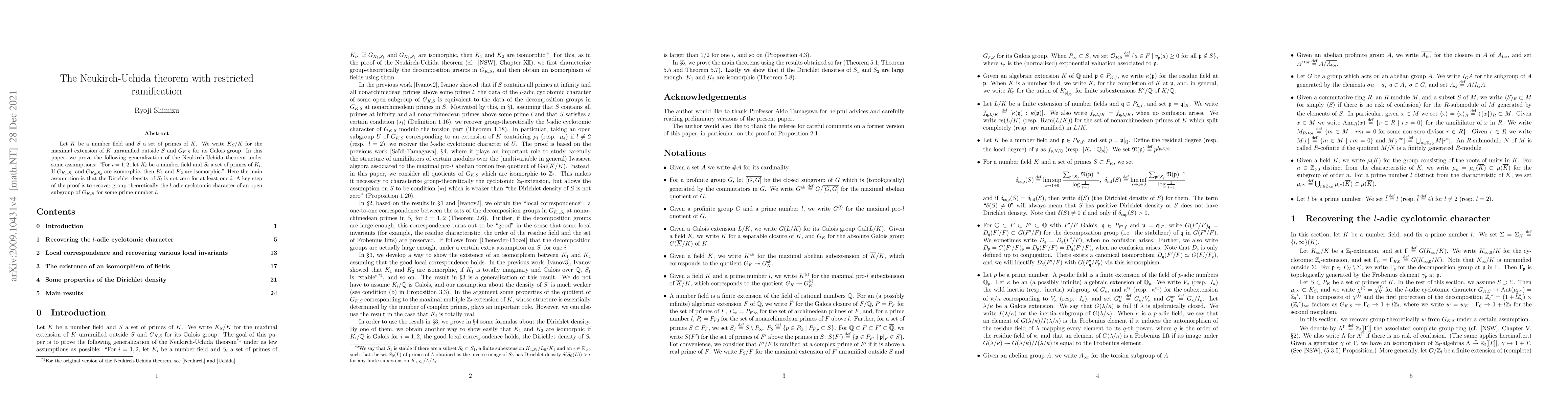 Let $K$ be a number field and $S$ a set of primes of $K$. We write $K_S/K$ for the maximal extension of $K$ unramified outside $S$ and $G_{K,S}$ for its Galois group. In this paper, we prove the following generalization of the Neukirch-Uchida theorem under some assumptions: "For $i=1,2$, let $K_i$ be a number field and $S_i$ a set of primes of $K_i$. If $G_{K_1,S_1}$ and $G_{K_2,S_2}$ are isomorphic, then $K_1$ and $K_2$ are isomorphic." Here the main assumption is that the Dirichlet density of $S_i$ is not zero for at least one $i$. A key step of the proof is to recover group-theoretically the $l$-adic cyclotomic character of an open subgroup of $G_{K,S}$ for some prime number $l$.