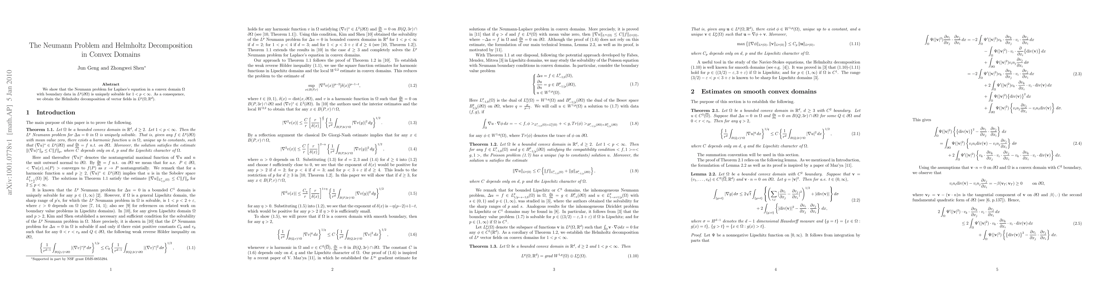 This paper demonstrates the unique solvability of the Neumann problem for Laplace's equation in convex domains with boundary data in $L^p$ spaces. It also derives the Helmholtz decomposition for vector fields in $L^p$ spaces within these domains.