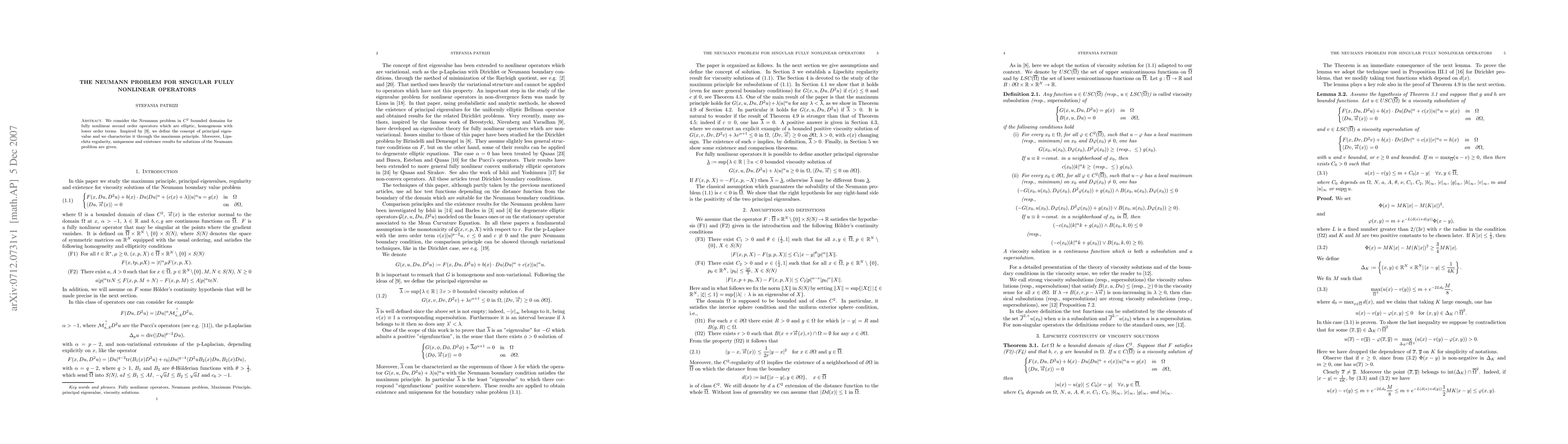 This paper studies the Neumann boundary value problem for elliptic, homogeneous fully nonlinear second-order operators in $C^2$ domains, introducing the concept of principal eigenvalue and proving its characterization through the maximum principle, along with results on Lipschitz regularity, uniqueness, and existence of solutions.