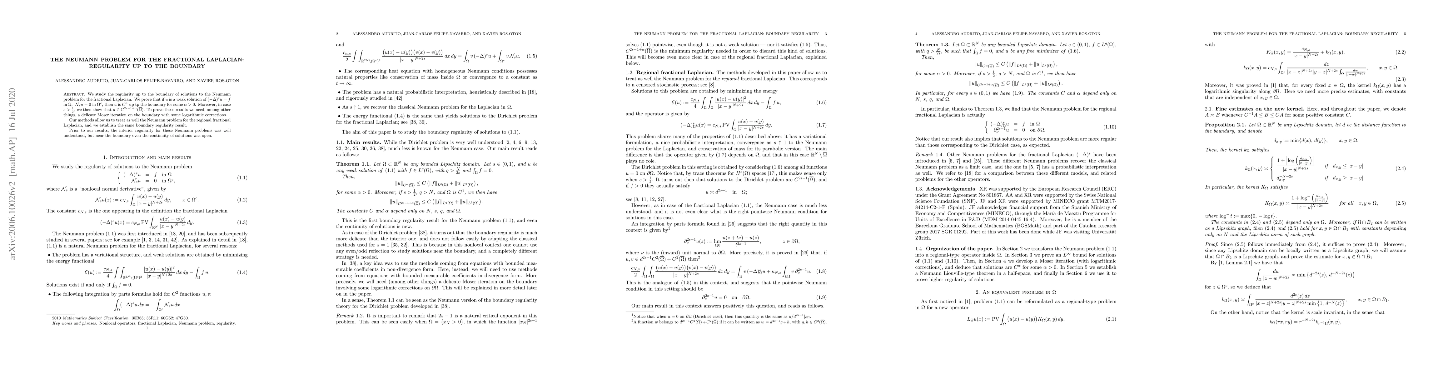 We study the regularity up to the boundary of solutions to the Neumann problem for the fractional Laplacian. We prove that if $u$ is a weak solution of $(-\Delta)^s u=f$ in $\Omega$, $\mathcal N_s u=0$ in $\Omega^c$, then $u$ is $C^\alpha$ up tp the boundary for some $\alpha>0$. Moreover, in case $s>\frac12$, we then show that $u\in C^{2s-1+\alpha}(\overline\Omega)$. To prove these results we need, among other things, a delicate Moser iteration on the boundary with some logarithmic corrections. Our methods allow us to treat as well the Neumann problem for the regional fractional Laplacian, and we establish the same boundary regularity result. Prior to our results, the interior regularity for these Neumann problems was well understood, but near the boundary even the continuity of solutions was open.