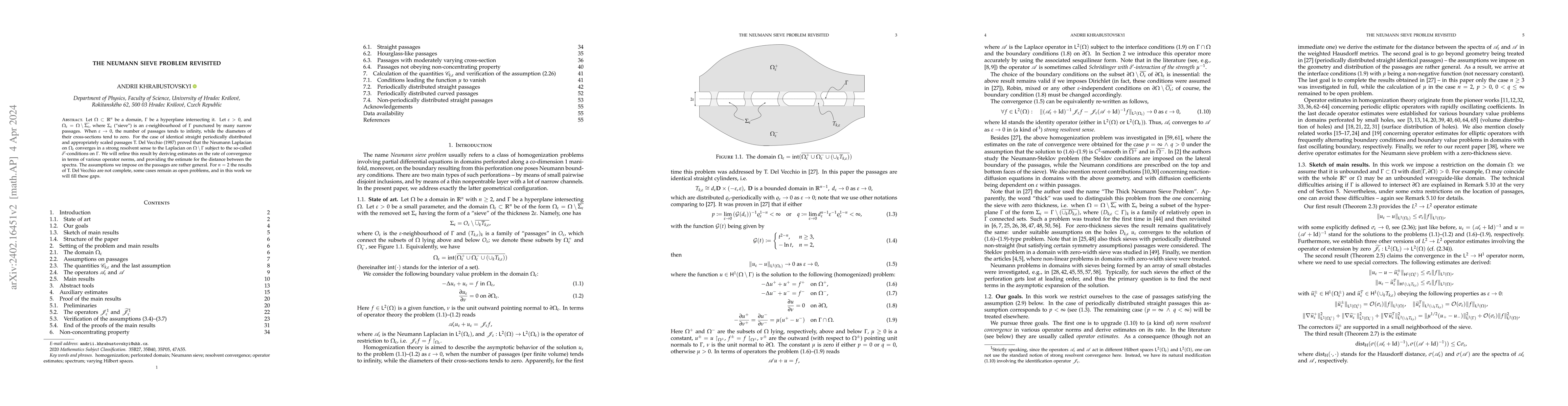 This paper revisits the Neumann sieve problem, focusing on the convergence of the Neumann Laplacian on a domain with narrow passages to the Laplacian on the same domain with a hyperplane removed. It refines previous results by estimating the rate of convergence and addressing open cases for two-dimensional domains.