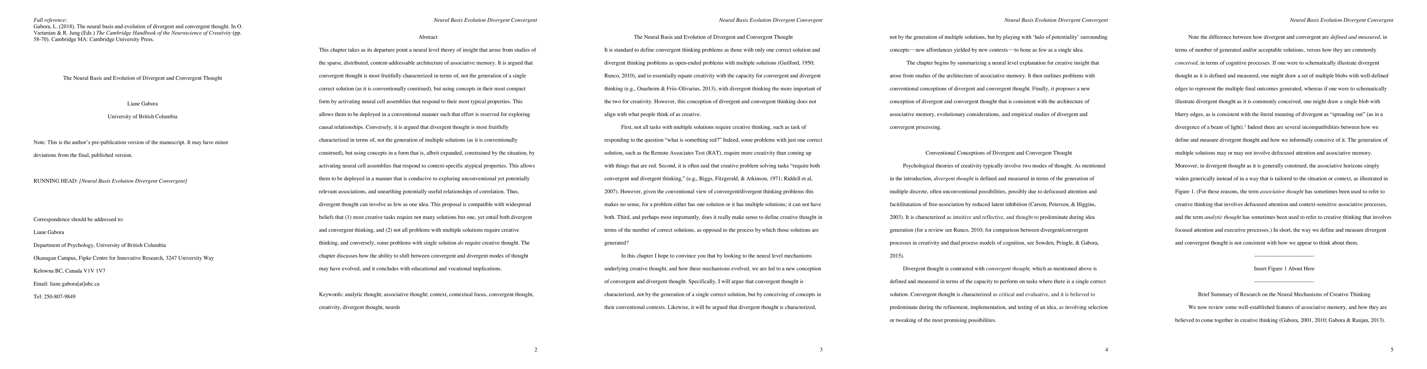 This chapter takes as its departure point a neural level theory of insight that arose from studies of the sparse, distributed, content-addressable architecture of associative memory. It is argued that convergent thought is most fruitfully characterized in terms of, not the generation of a single correct solution (as it is conventionally construed), but using concepts in their most compact form by activating neural cell assemblies that respond to their most typical properties. This allows them to be deployed in a conventional manner such that effort is reserved for exploring causal relationships. Conversely, it is argued that divergent thought is most fruitfully characterized in terms of, not the generation of multiple solutions (as it is conventionally construed), but using concepts in a form that is, albeit expanded, constrained by the situation, by activating neural cell assemblies that respond to context-specific atypical properties. This allows them to be deployed in a manner that is conducive to exploring unconventional yet potentially relevant associations, and unearthing potentially useful relationships of correlation. Thus, divergent thought can involve as few as one idea. This proposal is compatible with widespread beliefs that (1) most creative tasks require not many solutions but one, yet entail both divergent and convergent thinking, and (2) not all problems with multiple solutions require creative thinking, and conversely, some problems with single solution do require creative thought. The chapter discusses how the ability to shift between convergent and divergent modes of thought may have evolved, and it concludes with educational and vocational implications.