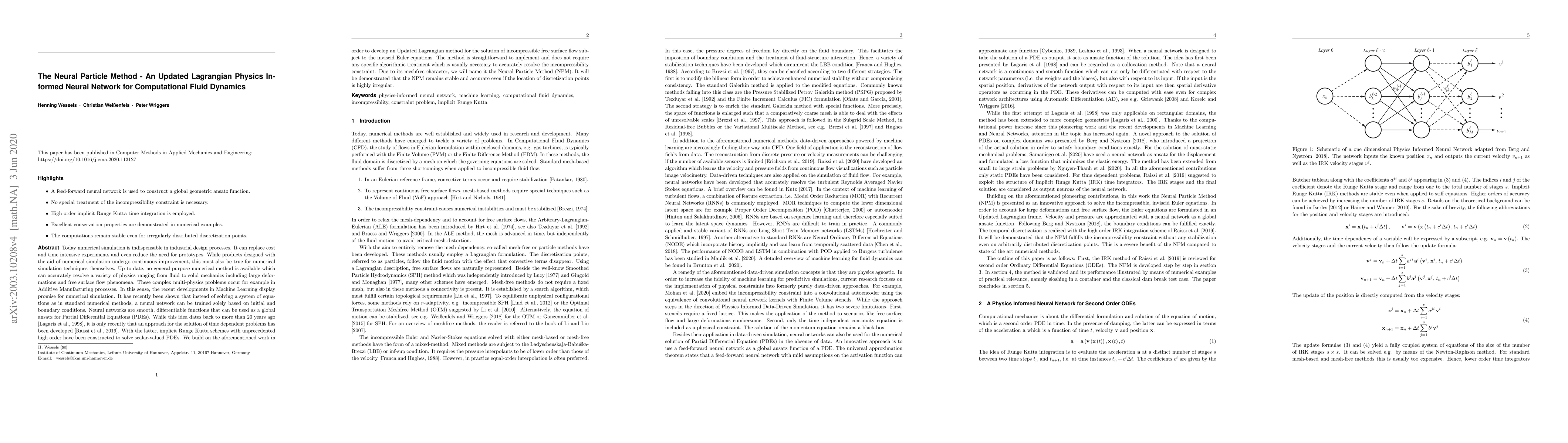 Numerical simulation is indispensable in industrial design processes. It can replace expensive experiments and even reduce the need for prototypes. While products designed with the aid of numerical simulation undergo continuous improvement, this must also be true for numerical simulation itself. Up to date, no general purpose numerical method is available which can accurately resolve a variety of physics ranging from fluid to solid mechanics including large deformations and free surface flow phenomena. These complex multi-physics problems occur for example in Additive Manufacturing processes. In this sense, the recent developments in Machine Learning display promise for numerical simulation. It has recently been shown that instead of solving a system of equations as in standard numerical methods, a neural network can be trained solely based on initial and boundary conditions. Neural networks are smooth, differentiable functions that can be used as a global ansatz for Partial Differential Equations (PDEs). While this idea dates back to more than 20 years ago [Lagaris et al., 1998], it is only recently that an approach for the solution of time dependent problems has been developed [Raissi et al., 2019]. With the latter, implicit Runge Kutta schemes with unprecedented high order have been constructed to solve scalar-valued PDEs. We build on the aforementioned work in order to develop an Updated Lagrangian method for the solution of incompressible free surface flow subject to the inviscid Euler equations. The method is easy to implement and does not require any specific algorithmic treatment which is usually necessary to accurately resolve the incompressibility constraint. Due to its meshfree character, we will name it the Neural Particle Method (NPM). It will be demonstrated that the NPM remains stable and accurate even if the location of discretization points is highly irregular.