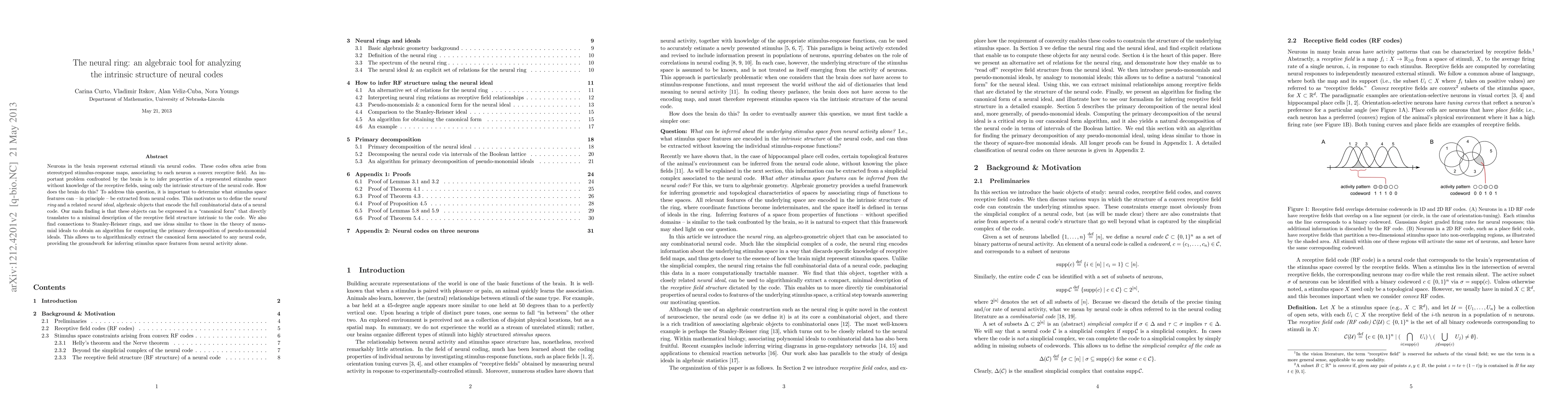 This paper introduces the neural ring and neural ideal as algebraic tools to analyze the intrinsic structure of neural codes, enabling the extraction of stimulus space features from neural activity without knowledge of individual receptive fields. The authors develop an algorithm for computing the canonical form of these objects, facilitating the inference of stimulus space properties from neural data.