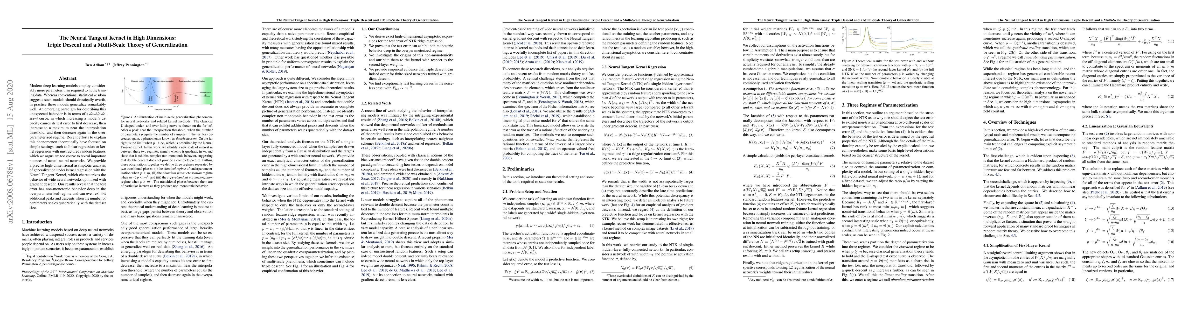 This paper explores the double descent phenomenon in high-dimensional neural networks using the Neural Tangent Kernel, revealing a multi-scale theory of generalization that includes triple descent behavior and additional peaks beyond the conventional double descent curve.