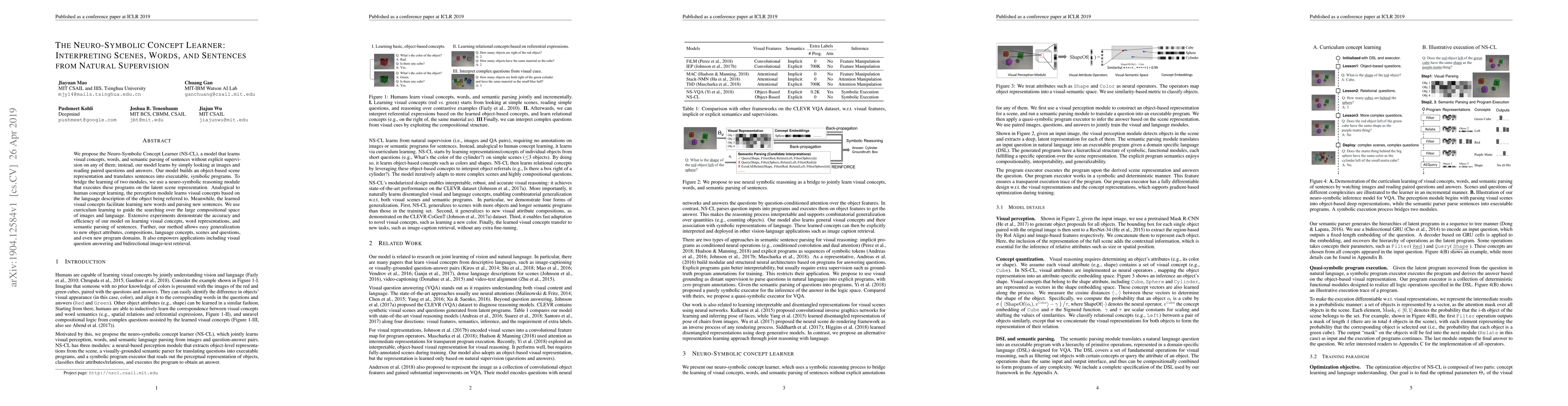 The Neuro-Symbolic Concept Learner (NS-CL) autonomously acquires visual concepts, word representations, and sentence parsing through natural supervision, enabling generalization to new domains and applications like visual question answering. The model integrates perception and reasoning modules to interpret scenes and translate sentences into symbolic programs.