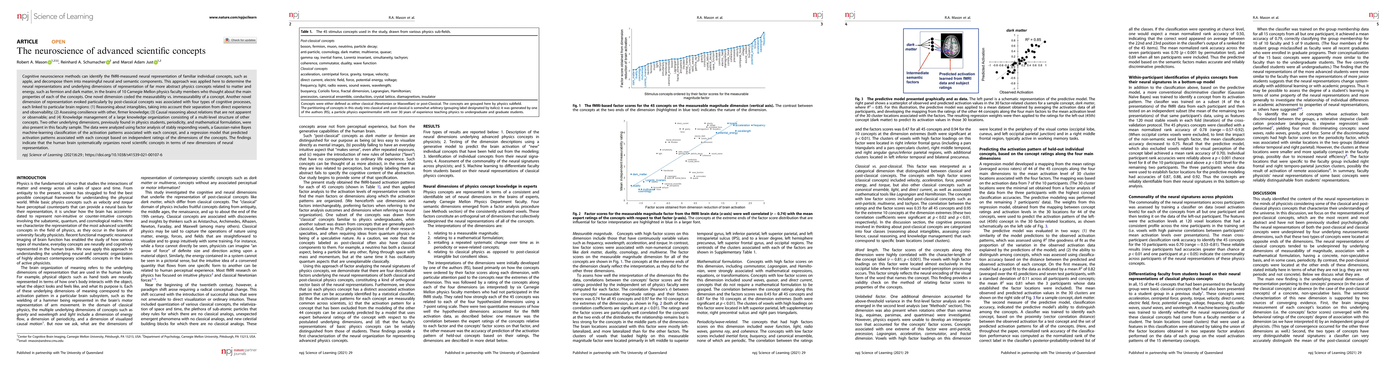 Researchers used fMRI to analyze brain activity in physics faculty while they thought about abstract concepts like fermions and dark matter, identifying new dimensions of neural representation including measurability and cognitive processes.