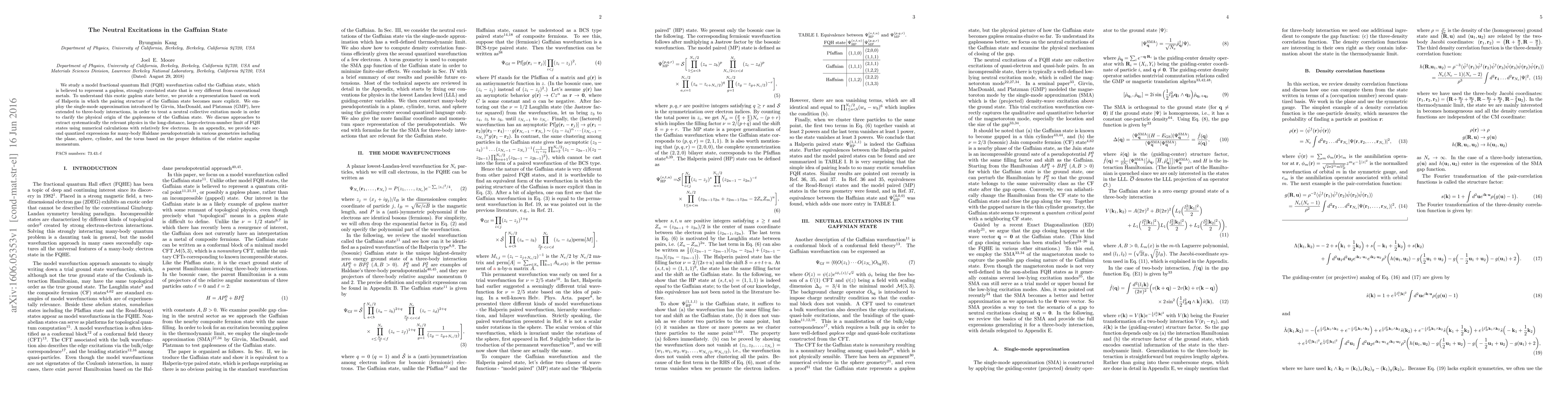 We study a model fractional quantum Hall (FQH) wavefunction called the Gaffnian state, which is believed to represent a gapless, strongly correlated state that is very different from conventional metals. To understand this exotic gapless state better, we provide a representation based on work of Halperin in which the pairing structure of the Gaffnian state becomes more explicit. We employ the single-mode approximation introduced by Girvin, MacDonald, and Platzman (GMP), here extended to three-body interactions, in order to treat a neutral collective exitation mode in order to clarify the physical origin of the gaplessness of the Gaffnian state. We discuss approaches to extract systematically the relevant physics in the long-distance, large-electron-number limit of FQH states using numerical calculations with relatively few electrons. In an appendix, we provide second quantized expressions for many-body Haldane pseudopotentials in various geometries including the plane, sphere, cylinder, and the torus based on the proper definition of the relative angular momentum.