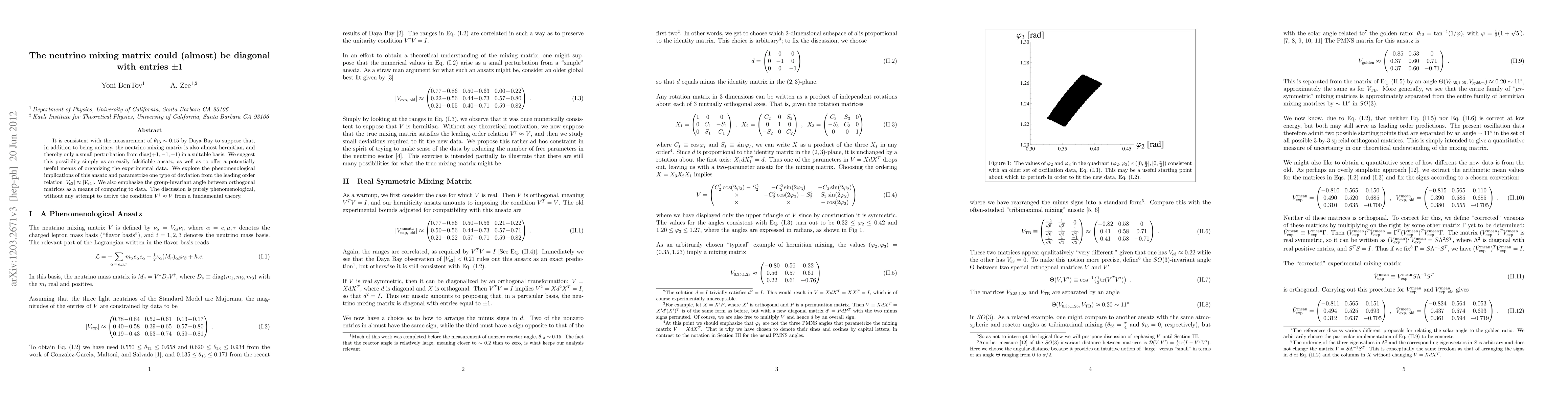 This paper proposes that the neutrino mixing matrix could be almost hermitian with entries (pm)1, consistent with ( heta_{13} approx 0.15) measured by Daya Bay. The authors suggest this as a falsifiable ansatz to organize experimental data, exploring phenomenological implications and comparing with data using group-invariant angles. The discussion is purely phenomenological without deriving the condition from fundamental theory.