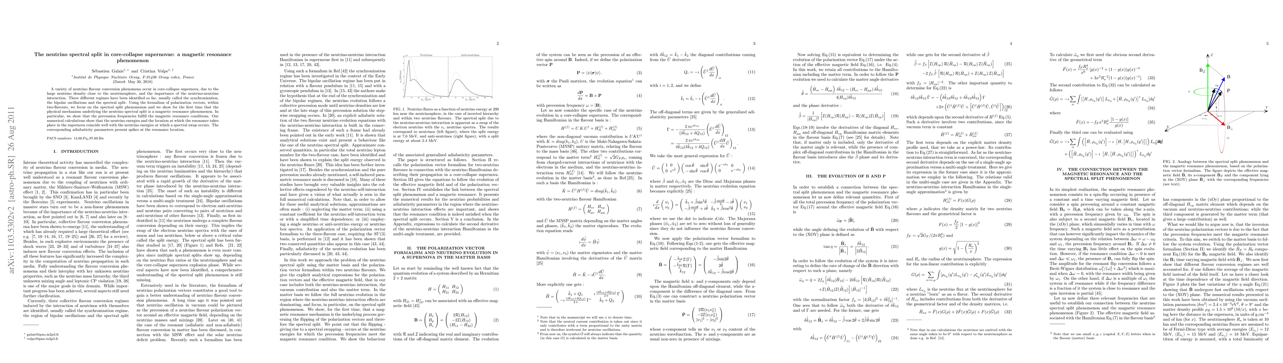 This paper investigates the neutrino spectral split in core-collapse supernovae, identifying it as a magnetic resonance phenomenon. The authors demonstrate that the precession frequencies meet magnetic resonance conditions, and numerical calculations confirm that the resonance location correlates with the spectral swap observed in neutrino energies.