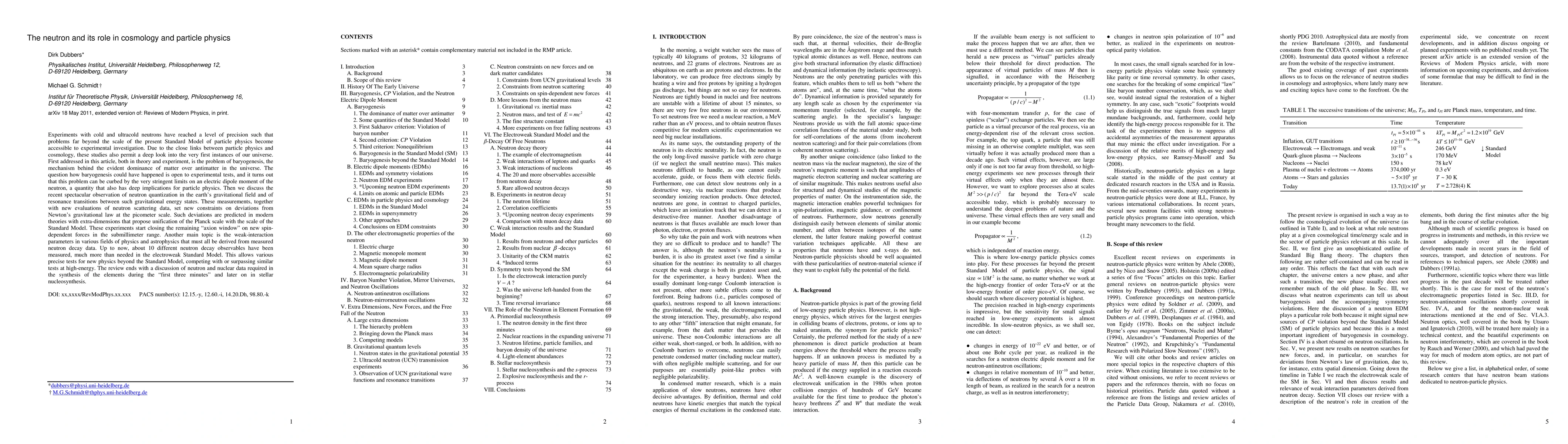 Researchers investigate the role of neutrons in cosmology and particle physics, including precision experiments that reveal new insights into baryogenesis, gravitational law, and neutron decay, with implications for understanding the universe's first moments and the Standard Model.