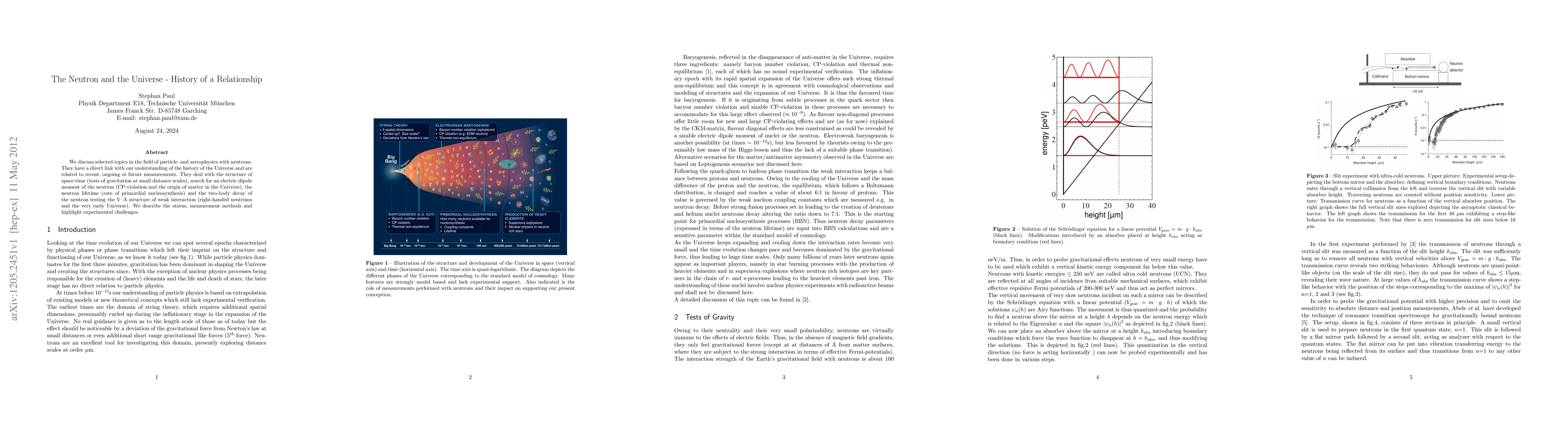 We discuss selected topics in the field of particle- and astrophysics with neutrons. They have a direct link with our understanding of the history of the Universe and are related to recent, ongoing or future measurements. They deal with the structure of space-time (tests of gravitation at small distance scales), search for an electric dipole moment of the neutron (CP-violation and the origin of matter in the Universe), the neutron lifetime (rate of primordial nucleosynthesis) and the two-body decay of the neutron testing the V--A structure of weak interaction (right-handed neutrinos and the very early Universe). We describe the status, measurement methods and highlight experimental challenges.