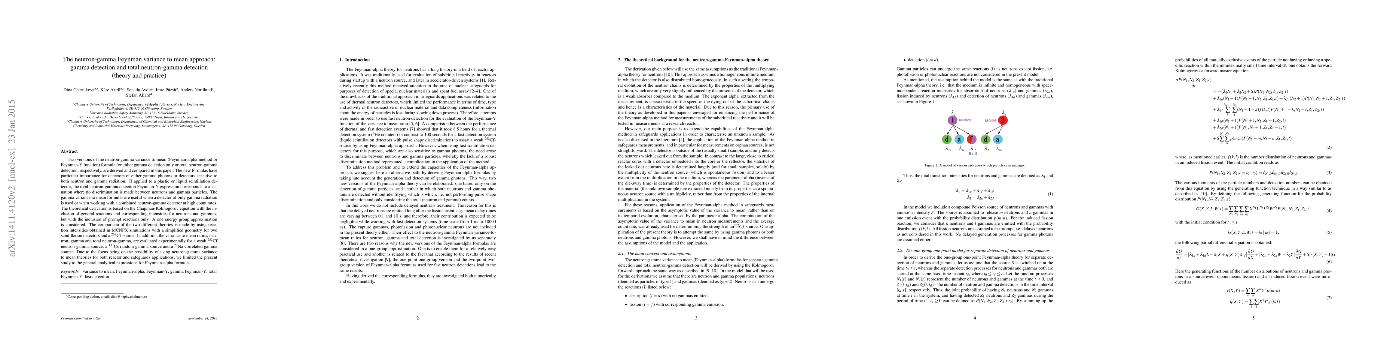 Two versions of the neutron-gamma variance to mean (Feynman-alpha method or Feynman-Y function) formula for either gamma detection only or total neutron-gamma detection, respectively, are derived and compared in this paper. The new formulas have a particular importance for detectors of either gamma photons or detectors sensitive to both neutron and gamma radiation. If applied to a plastic or liquid scintillation detector, the total neutron-gamma detection Feynman-Y expression corresponds to a situation where no discrimination is made between neutrons and gamma particles. The gamma variance to mean formulas are useful when a detector of only gamma radiation is used or when working with a combined neutron-gamma detector at high count rates. The theoretical derivation is based on the Chapman-Kolmogorov equation with inclusion of general reactions and passage intensities for neutrons and gammas, but with the inclusion of prompt reactions only. A one energy group approximation is considered. The comparison of the two different theories is made by using reaction intensities obtained in MCNPX simulations with a simplified geometry for two scintillation detectors and a 252Cf-source enclosed in a steel container. In addition, the variance to mean ratios, neutron, gamma and total neutron-gamma, are evaluated experimentally for a weak 252Cf neutron-gamma source in a steel container, a 137Cs random gamma source and a 22Na correlated gamma source. Due to the focus being on the possibility of using neutron-gamma variance to mean theories for both reactor and safeguards applications, we limited the present study to the general analytical expressions for Feynman-Y formulas.