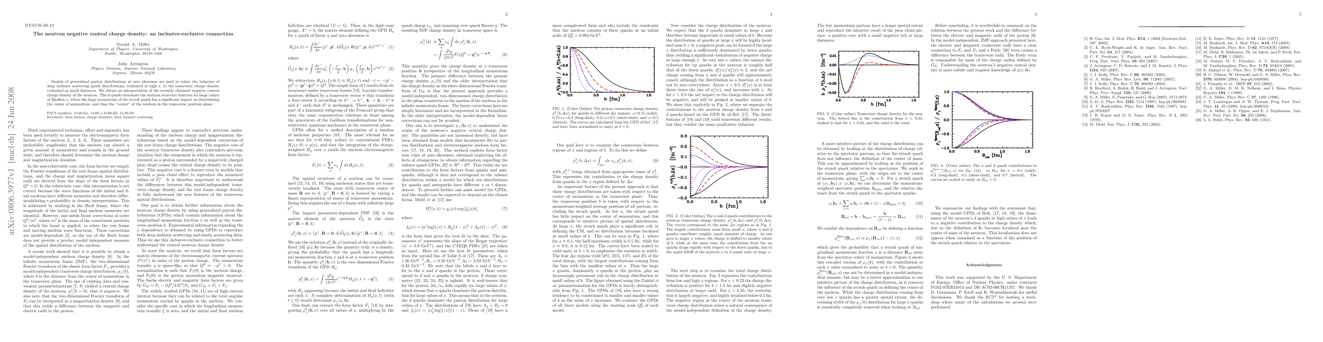 Models of generalized parton distributions at zero skewness are used to relate the behavior of deep inelastic scattering quark distributions, evaluated at high x, to the transverse charge density evaluated at small distances. We obtain an interpretation of the recently obtained negative central charge density of the neutron. The d quarks dominate the neutron structure function for large values of Bjorken x, where the large momentum of the struck quark has a significant impact on determining the center of momentum, and thus the ``center'' of the nucleon in the transverse position plane.