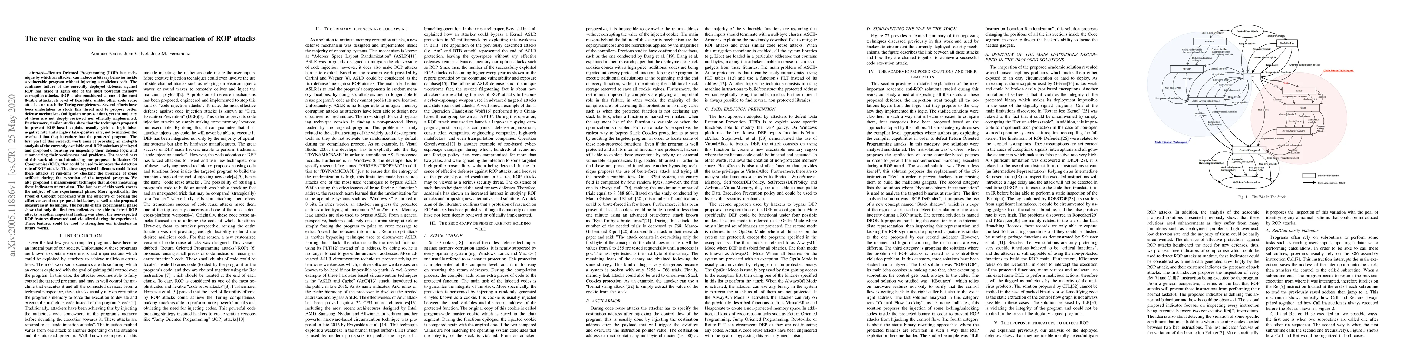 Return Oriented Programming (ROP) is a technique by which an attacker can induce arbitrary behavior inside a vulnerable program without injecting a malicious code. The continues failure of the currently deployed defenses against ROP has made it again one of the most powerful memory corruption attacks. ROP is also considered as one of the most flexible attacks, its level of flexibility, unlike other code reuse attacks, can reach the Turing completeness. Several efforts have been undertaken to study this threat and to propose better defense mechanisms (mitigation or prevention), yet the majority of them are not deeply reviewed nor officially implemented.Furthermore, similar studies show that the techniques proposed to prevent ROP-based exploits usually yield a high false-negative rate and a higher false-positive rate, not to mention the overhead that they introduce into the protected program. The first part of this research work aims at providing an in-depth analysis of the currently available anti-ROP solutions (deployed and proposed), focusing on inspecting their defense logic and summarizing their weaknesses and problems. The second part of this work aims at introducing our proposed Indicators Of Compromise (IOCs) that could be used to improve the detection rate of ROP attacks. The three suggested indicators could detect these attacks at run-time by checking the presence of some artifacts during the execution of the targeted program.