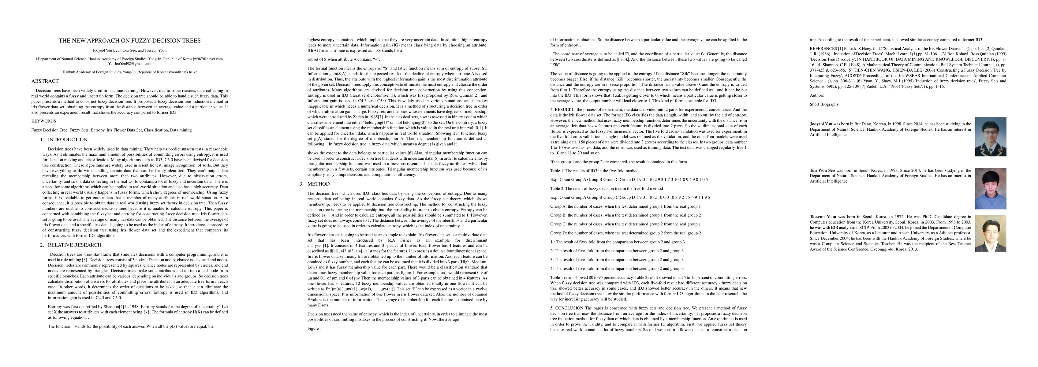 The paper proposes a fuzzy decision tree induction method using the iris flower dataset, calculating entropy from the distance between an average value and a particular value. It introduces a procedure for constructing fuzzy decision trees and compares its performance with the ID3 algorithm.