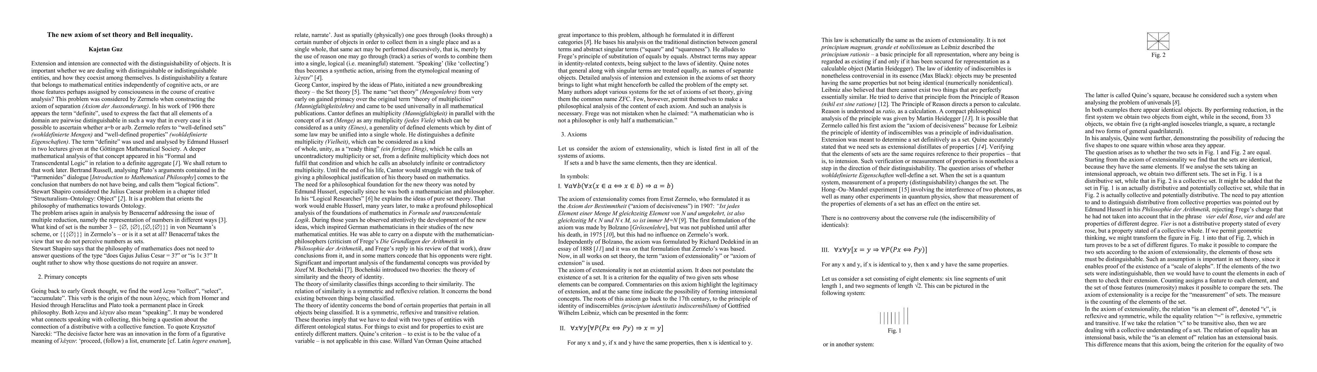 The introduction of the axiom of existence of sets provides a novel technical contribution to set theory, allowing for a different formulation of Bell inequality in quantum mechanics.