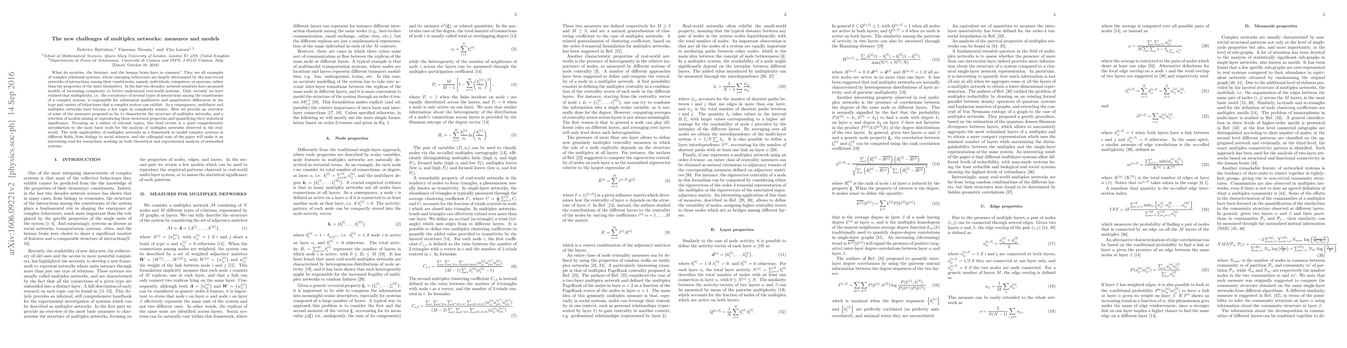 This paper reviews measures and models for analyzing multiplex networks, highlighting their importance in understanding complex systems like societies and the Internet. It provides an introduction to tools for characterizing and modeling the structural properties of multiplex networks, emphasizing their broad applicability across various fields.