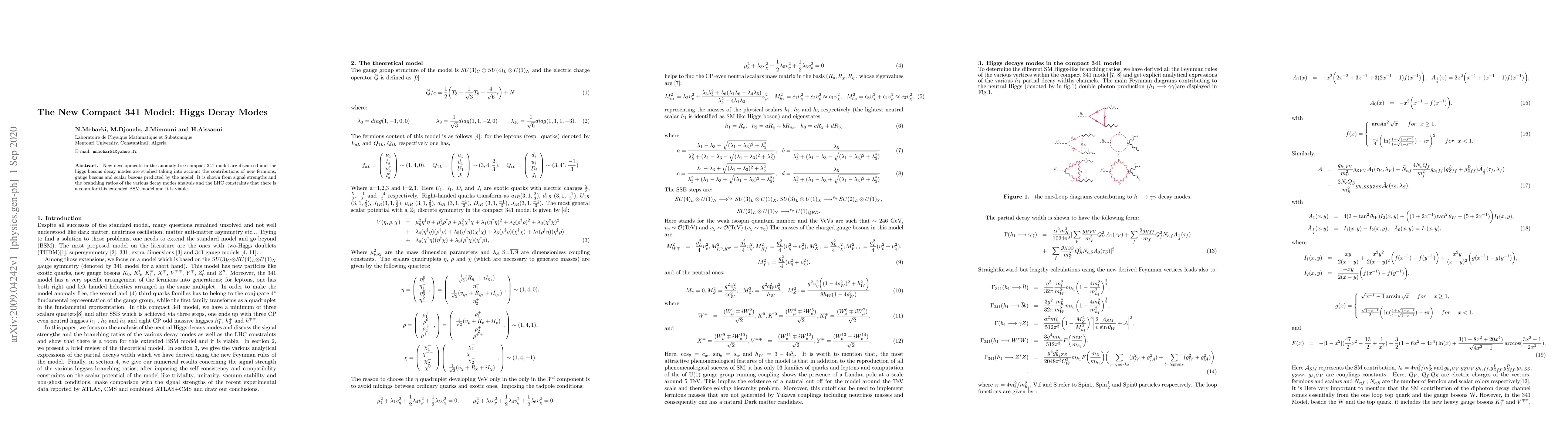 New developments in the anomaly free compact 341 model are discussed and the higgs bosons decay modes are studied taking into account the contributions of new fermions, gauge bosons and scalar bosons predicted by the model. It is shown from signal strengths and the branching ratios of the various decay modes analysis and the LHC constraints that there is a room for this extended BSM model and it is viable.