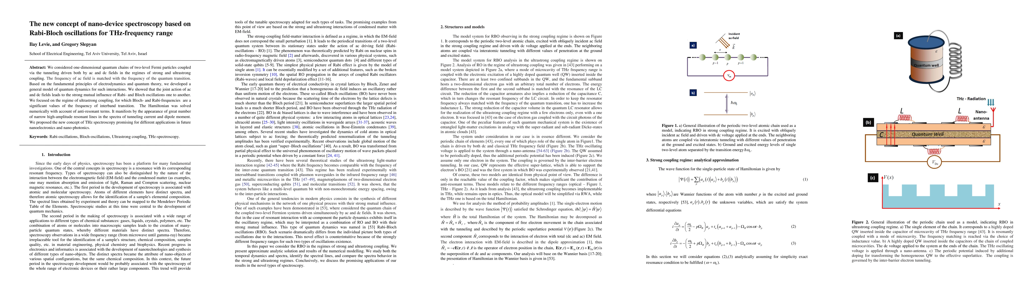 This paper introduces a novel nano-device spectroscopy concept based on Rabi-Bloch oscillations for THz-frequency range, utilizing quantum chains of two-level Fermi particles under strong and ultrastrong coupling regimes. The model reveals significant mutual influence between Rabi and Bloch oscillations, leading to numerous high-amplitude resonant lines in tunneling current and dipole moment spectra, promising for future nanoelectronics and nano-photonics applications.