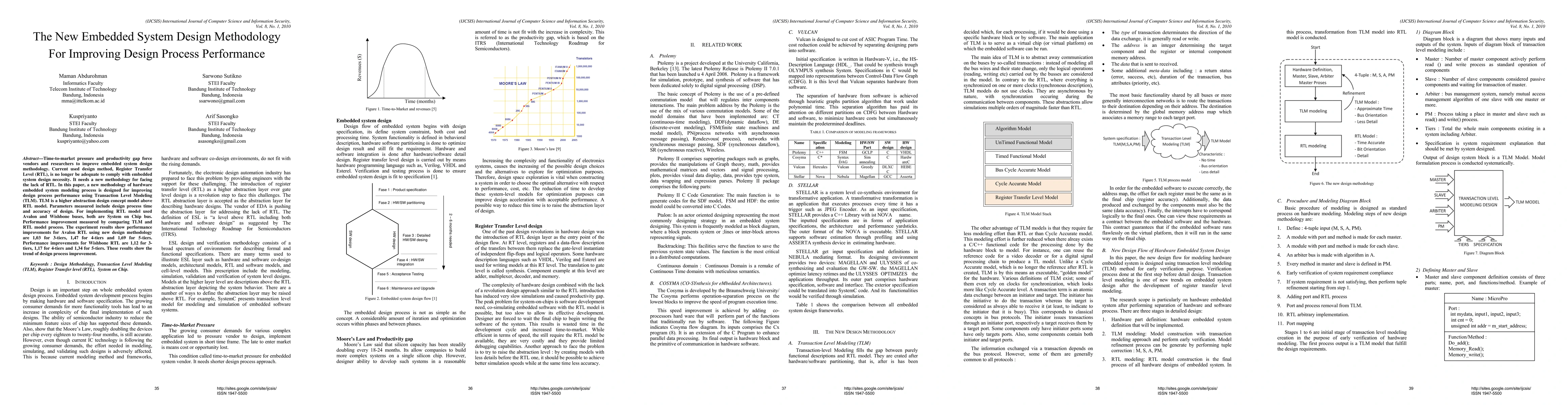 A new embedded system design methodology is introduced to improve design process performance using Transaction Level Modeling (TLM), resulting in 1.03-1.69 time improvements for Avalon and 1.12-1.34 time improvements for Wishbone RTL models.