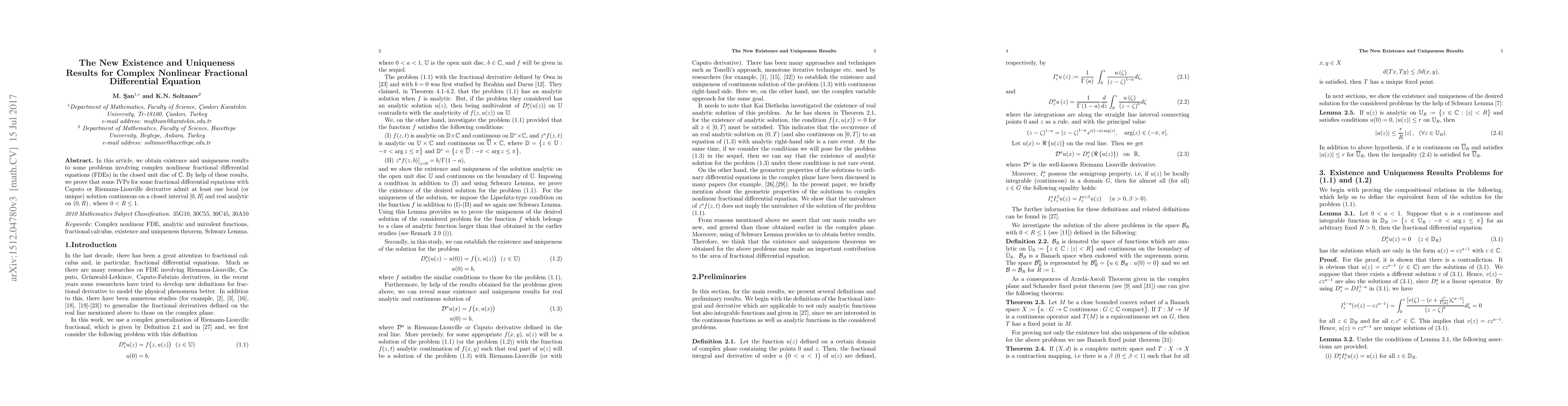 This research establishes new existence and uniqueness results for complex nonlinear fractional differential equations within the closed unit disc of the complex plane. It proves that certain initial value problems (IVPs) for these equations have at least one local or unique solution, continuous on a closed interval [0,R] and real analytic on (0,R), where 0<R≤1.