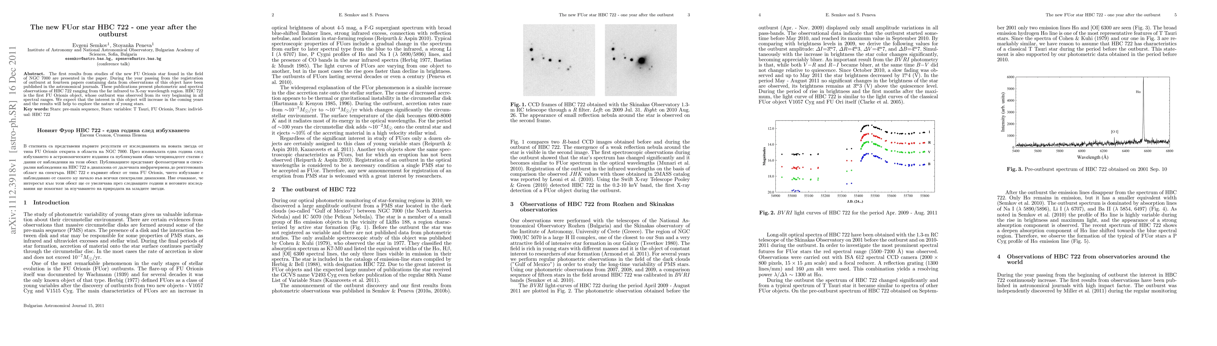 The first results from studies of the new FU Orionis star found in the field of NGC 7000 are presented in the paper. During the year passing from the registration of outburst at fourteen papers containing data from observations of this object have been published in the astronomical journals. These publications present photometric and spectral observations of HBC 722 ranging from the far infrared to X-ray wavelength region. HBC 722 is the first FU Orionis object, whose outburst was observed from its very beginning in all spectral ranges. We expect that the interest in this object will increase in the coming years and the results will help to explore the nature of young stars.