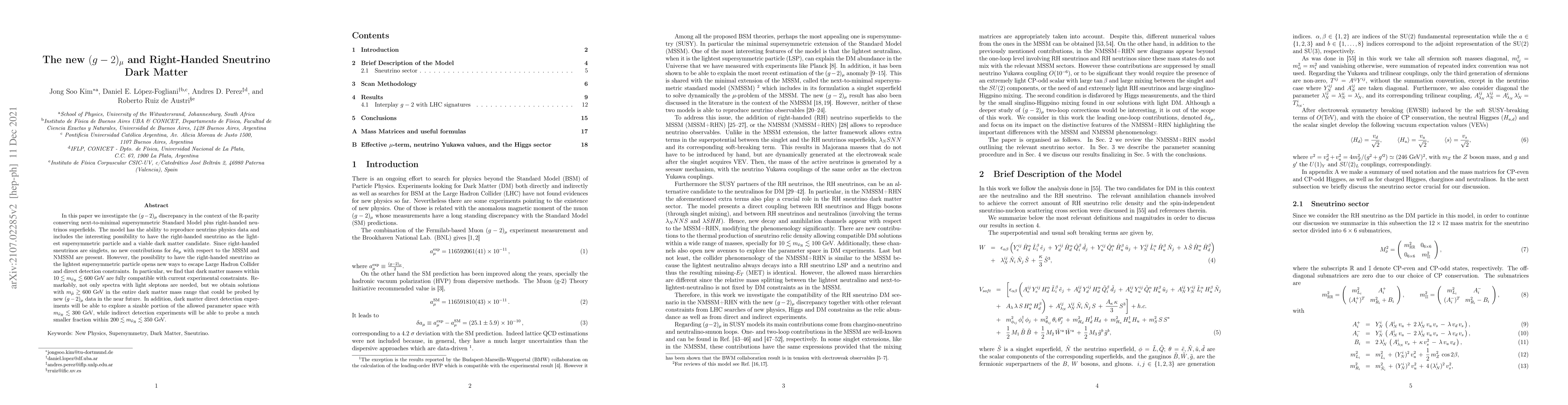 This paper explores the $(g-2)_\mu$ discrepancy within an extended supersymmetric model featuring right-handed sneutrinos, proposing them as viable dark matter candidates. The study finds that right-handed sneutrinos within a mass range of $10 \lesssim m_{\tilde{\nu}_{R}} \lesssim 600$ GeV satisfy experimental constraints and could be detected by future $(g-2)_\mu$ and dark matter experiments.
